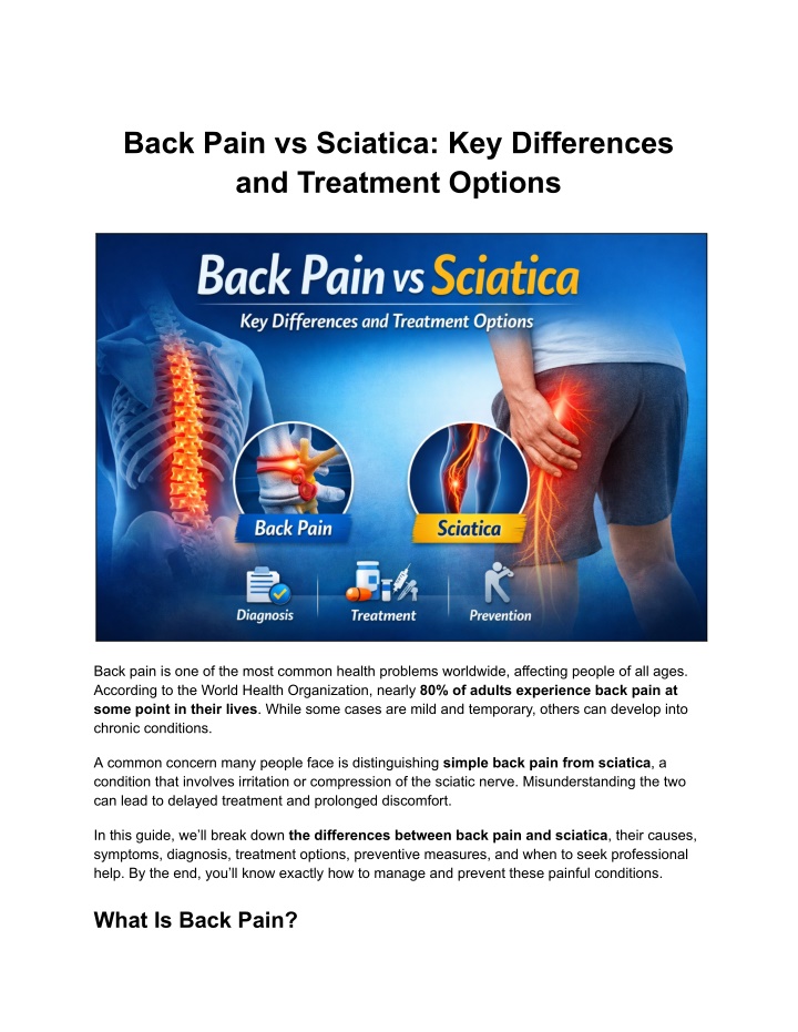 Back Pain vs Sciatica: Key Differences and Treatment Options Back pain is one of the most common health problems worldwide, affecting people of all ages. According to the World Health Organization, nearly 80% of adults experience back pain at some point in their lives. While some cases are mild and temporary, others can develop into chronic conditions. A common concern many people face is distinguishing simple back pain from sciatica, a condition that involves irritation or compression of the sciatic nerve. Misunderstanding the two can lead to delayed treatment and prolonged discomfort. In this guide, we’ll break down the differences between back pain and sciatica, their causes, symptoms, diagnosis, treatment options, preventive measures, and when to seek professional help. By the end, you’ll know exactly how to manage and prevent these painful conditions. What Is Back Pain?