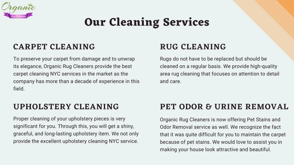 Our Cleaning Services CARPET CLEANING To preserve your carpet from damage and to unwrap its elegance, Organic Rug Cleaners provide the best carpet cleaning NYC services in the market as the company has more than a decade of experience in this field. RUG CLEANING Rugs do not have to be replaced but should be cleaned on a regular basis. We provide high-quality area rug cleaning that focuses on attention to detail and care. UPHOLSTERY CLEANING Proper cleaning of your upholstery pieces is very significant for you. Through this, you will get a shiny, graceful, and long-lasting upholstery item. We not only provide the excellent upholstery cleaning NYC service. PET ODOR & URINE REMOVAL Organic Rug Cleaners is now offering Pet Stains and Odor Removal service as well. We recognize the fact that it was quite difficult for you to maintain the carpet because of pet stains. We would love to assist you in making your house look attractive and beautiful.