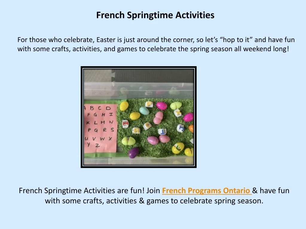 French Springtime Activities For those who celebrate, Easter is just around the corner, so let’s “hop to it” and have fun with some crafts, activities, and games to celebrate the spring season all weekend long! French Springtime Activities are fun! Join French Programs Ontario & have fun with some crafts, activities &games to celebrate spring season.