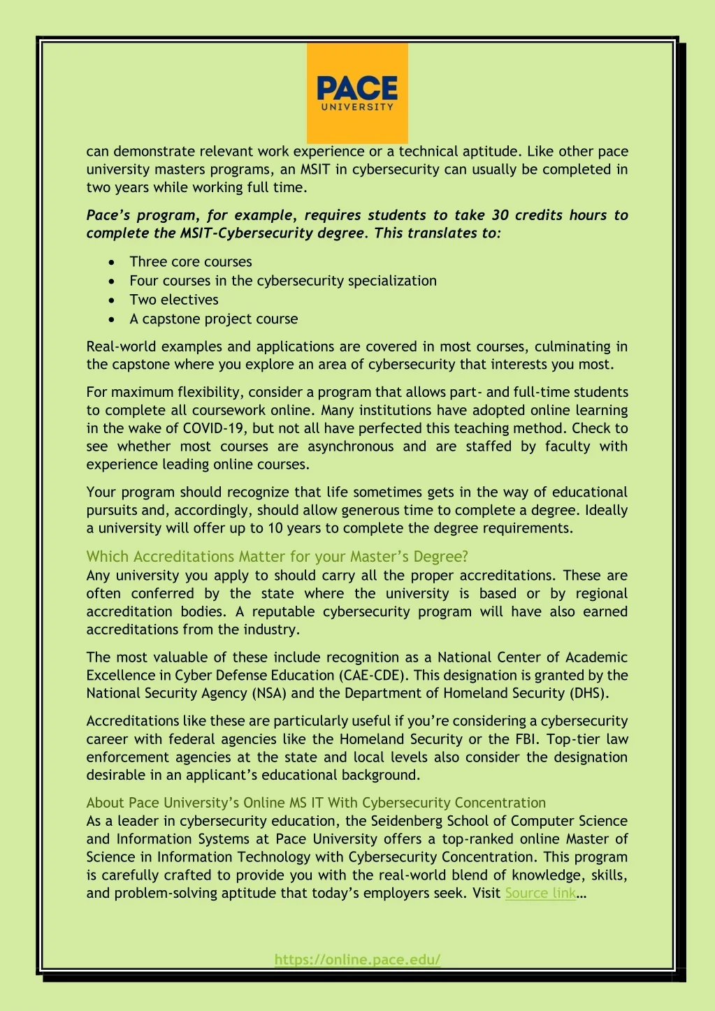 can demonstrate relevant work experience or a technical aptitude. Like other pace university masters programs, an MSIT in cybersecurity can usually be completed in two years while working full time. Pace’s program, for example, requires students to take 30 credits hours to complete the MSIT-Cybersecurity degree. This translates to: Three core courses Four courses in the cybersecurity specialization Two electives A capstone project course Real-world examples and applications are covered in most courses, culminating in the capstone where you explore an area of cybersecurity that interests you most. For maximum flexibility, consider a program that allows part- and full-time students to complete all coursework online. Many institutions have adopted online learning in the wake of COVID-19, but not all have perfected this teaching method. Check to see whether most courses are asynchronous and are staffed by faculty with experience leading online courses. Your program should recognize that life sometimes gets in the way of educational pursuits and, accordingly, should allow generous time to complete a degree. Ideally a university will offer up to 10 years to complete the degree requirements. Which Accreditations Matter for your Master’s Degree? Any university you apply to should carry all the proper accreditations. These are often conferred by the state where the university is based or by regional accreditation bodies. A reputable cybersecurity program will have also earned accreditations from the industry. The most valuable of these include recognition as a National Center of Academic Excellence in Cyber Defense Education (CAE-CDE). This designation is granted by the National Security Agency (NSA) and the Department of Homeland Security (DHS). Accreditations like these are particularly useful if you’re considering a cybersecurity career with federal agencies like the Homeland Security or the FBI. Top-tier law enforcement agencies at the state and local levels also consider the designation desirable in an applicant’s educational background. About Pace University’s Online MS IT With Cybersecurity Concentration As a leader in cybersecurity education, the Seidenberg School of Computer Science and Information Systems at Pace University offers a top-ranked online Master of Science in Information Technology with Cybersecurity Concentration. This program is carefully crafted to provide you with the real-world blend of knowledge, skills, and problem-solving aptitude that today’s employers seek. Visit Source link… https://online.pace.edu/