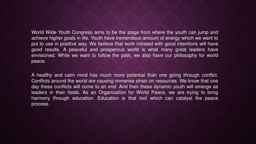 Project analysis slide 4 World Wide Youth Congress aims to be the stage from where the youth can jump and achieve higher goals in life. Youth have tremendous amount of energy which we want to put to use in positive way. We believe that work initiated with good intentions will have good results. A peaceful and prosperous world is what many great leaders have envisioned. While we want to follow the path, we also have our philosophy for world peace. A healthy and calm mind has much more potential than one going through conflict. Conflicts around the world are causing immense strain on resources. We know that one day these conflicts will come to an end. And then these dynamic youth will emerge as leaders in their fields. As an Organization for World Peace, we are trying to bring harmony through education. Education is that tool which can catalyst the peace process.
