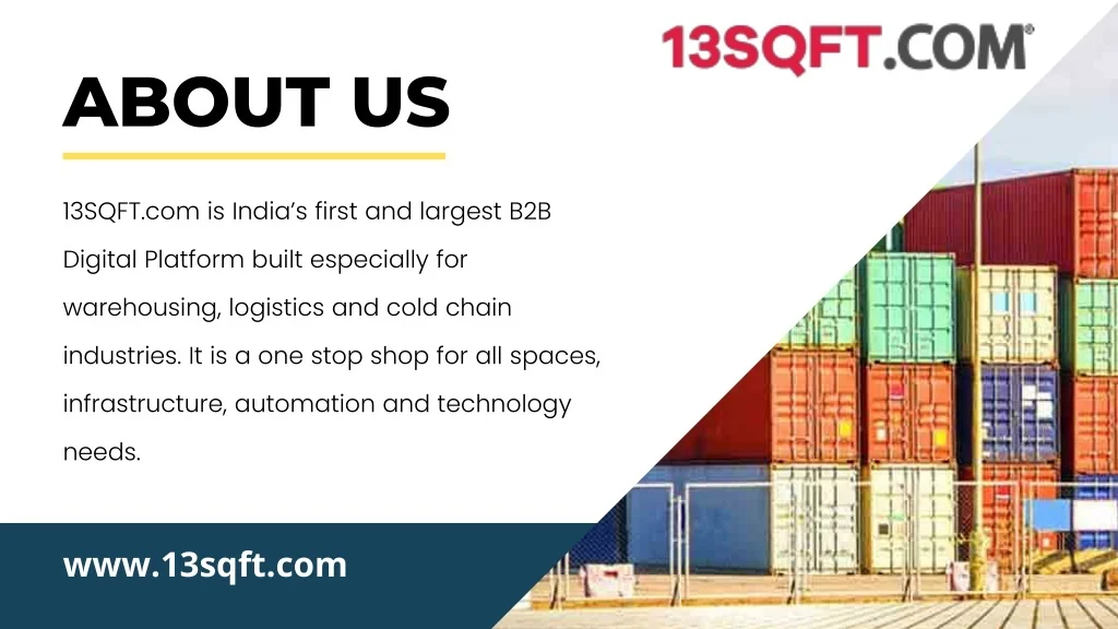 ABOUT US 13SQFT.com is India’s first and largest B2B Digital Platform built especially for warehousing, logistics and cold chain industries. It is a one stop shop for all spaces, infrastructure, automation and technology needs. www.13sqft.com