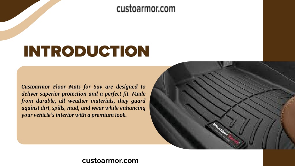 INTRODUCTION Custoarmor Floor Mats for Suv are designed to deliver superior protection and a perfect fit. Made from durable, all weather materials, they guard against dirt, spills, mud, and wear while enhancing your vehicle’s interior with a premium look. custoarmor.com
