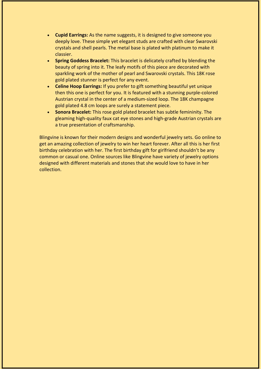Cupid Earrings: As the name suggests, it is designed to give someone you deeply love. These simple yet elegant studs are crafted with clear Swarovski crystals and shell pearls. The metal base is plated with platinum to make it classier. Spring Goddess Bracelet: This bracelet is delicately crafted by blending the beauty of spring into it. The leafy motifs of this piece are decorated with sparkling work of the mother of pearl and Swarovski crystals. This 18K rose gold plated stunner is perfect for any event. Celine Hoop Earrings: If you prefer to gift something beautiful yet unique then this one is perfect for you. It is featured with a stunning purple-colored Austrian crystal in the center of a medium-sized loop. The 18K champagne gold plated 4.8 cm loops are surely a statement piece. Sonora Bracelet: This rose gold plated bracelet has subtle femininity. The gleaming high-quality faux cat eye stones and high-grade Austrian crystals are a true presentation of craftsmanship. Blingvine is known for their modern designs and wonderful jewelry sets. Go online to get an amazing collection of jewelry to win her heart forever. After all this is her first birthday celebration with her. The first birthday gift for girlfriend shouldn’t be any common or casual one. Online sources like Blingvine have variety of jewelry options designed with different materials and stones that she would love to have in her collection.