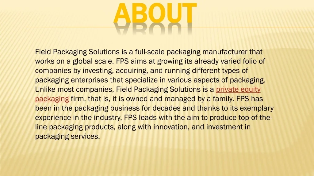 Field Packaging Solutions has been in the packaging business for decades and thanks to its exemplary experience in the industry, FPS leads with the aim to produce top-of-the-line packaging products, along with innovation, and investment in packaging services. It aims at growing its already varied folio of companies by investing, acquiring, and running different types of packaging enterprises that specialize in various aspects of packaging. Unlike most companies, Field Packaging Solutions is a private equity packaging firm, that is, it is owned and managed by a family.