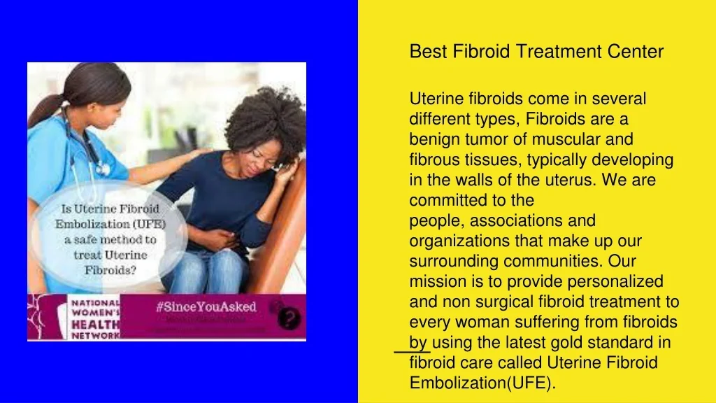 Best Fibroid Treatment Center Uterine fibroids come in several different types, Fibroids are a benign tumor of muscular and fibrous tissues, typically developing in the walls of the uterus. We are committed to the people, associations and organizations that make up our surrounding communities. Our mission is to provide personalized and non surgical fibroid treatment to every woman suffering from fibroids by using the latest gold standard in fibroid care called Uterine Fibroid Embolization(UFE). Long Beach 6:28am