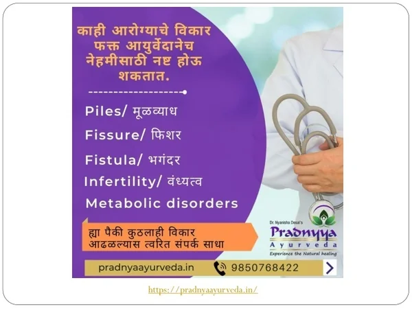 Along with our specialties<br>ud83dudc49ud83cudffb Piles<br>ud83dudc49ud83cudffb Fissure<br>ud83dudc49ud83cudffb Fistula<br>ud83dudc49ud83cudffb Beej Shudhi<br>ud83dudc49ud83cudffb Infertility<br>ud83dudc49ud83cudffb Panchakarma<br>ud83dudc49ud83cudffb Metabolic Disorders<br>ud83dudc49ud83cudffb Kshar Sutra Treatment<br>We also help you to recover fromud83eude7a<br>Beauty Treatment Or Spa Therapyud83dude0aud83dude0a<br>Cancer<br>Cardiac Disorders<br>Diabetes<br>Garbh sanskar<br>Joint & Spine Disorders (Vata Disorders)<br>Mental stress and strain<br>Obesity<br>Other Diseases<br>Stomach Disorders<br>Swarna Bindu Prashan<br>Thyroid<br>Vitiligo<br><br>Contact us: 9850768422<br>dr.nyanishadesai@gmail.com<br>Visit us: http://pradnyaayurveda.in