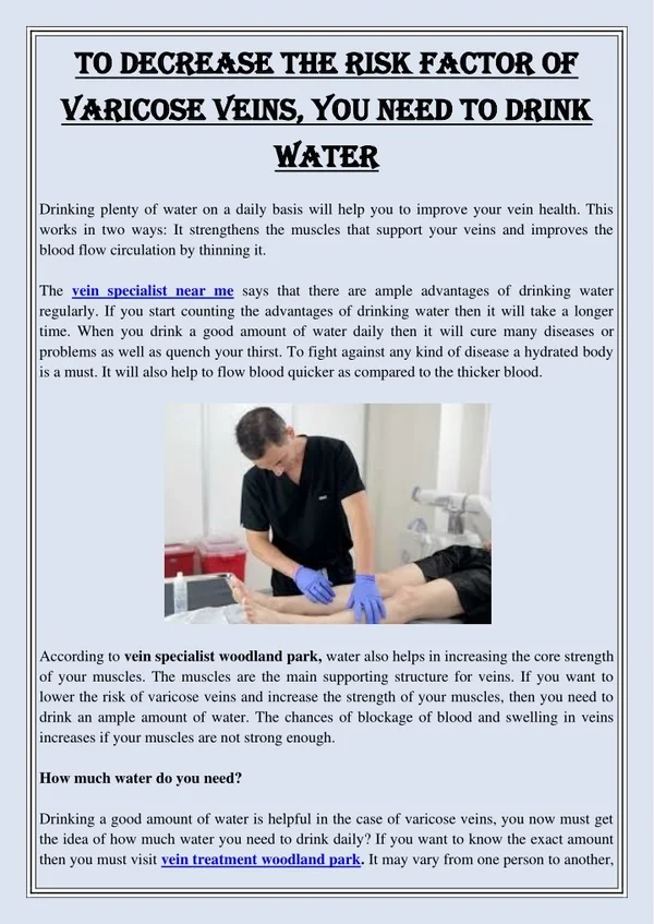 To decrease the risk factor of To decrease the risk factor of varicose veins, you need to drink varicose veins, you need to drink water water Drinking plenty of water on a daily basis will help you to improve your vein health. This works in two ways: It strengthens the muscles that support your veins and improves the blood flow circulation by thinning it. The vein specialist near me says that there are ample advantages of drinking water regularly. If you start counting the advantages of drinking water then it will take a longer time. When you drink a good amount of water daily then it will cure many diseases or problems as well as quench your thirst. To fight against any kind of disease a hydrated body is a must. It will also help to flow blood quicker as compared to the thicker blood. According to vein specialist woodland park, water also helps in increasing the core strength of your muscles. The muscles are the main supporting structure for veins. If you want to lower the risk of varicose veins and increase the strength of your muscles, then you need to drink an ample amount of water. The chances of blockage of blood and swelling in veins increases if your muscles are not strong enough. How much water do you need? Drinking a good amount of water is helpful in the case of varicose veins, you now must get the idea of how much water you need to drink daily? If you want to know the exact amount then you must visit vein treatment woodland park. It may vary from one person to another,