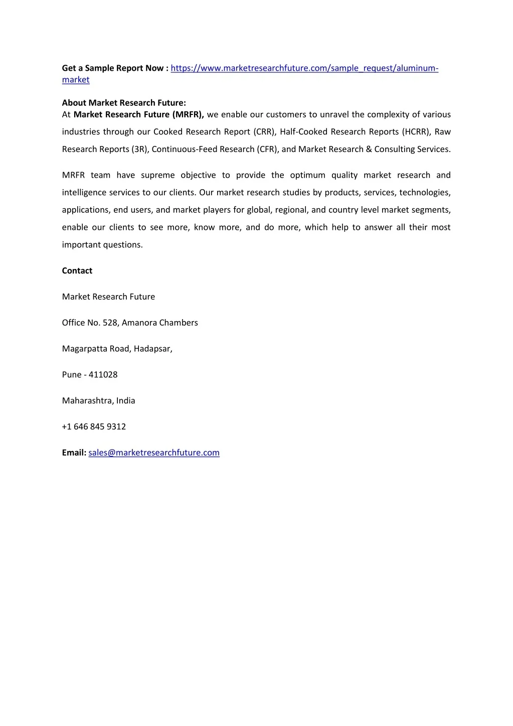 Get a Sample Report Now : https://www.marketresearchfuture.com/sample_request/aluminum- market About Market Research Future: At Market Research Future (MRFR), we enable our customers to unravel the complexity of various industries through our Cooked Research Report (CRR), Half-Cooked Research Reports (HCRR), Raw Research Reports (3R), Continuous-Feed Research (CFR), and Market Research & Consulting Services. MRFR team have supreme objective to provide the optimum quality market research and intelligence services to our clients. Our market research studies by products, services, technologies, applications, end users, and market players for global, regional, and country level market segments, enable our clients to see more, know more, and do more, which help to answer all their most important questions. Contact Market Research Future Office No. 528, Amanora Chambers Magarpatta Road, Hadapsar, Pune - 411028 Maharashtra, India +1 646 845 9312 Email: sales@marketresearchfuture.com