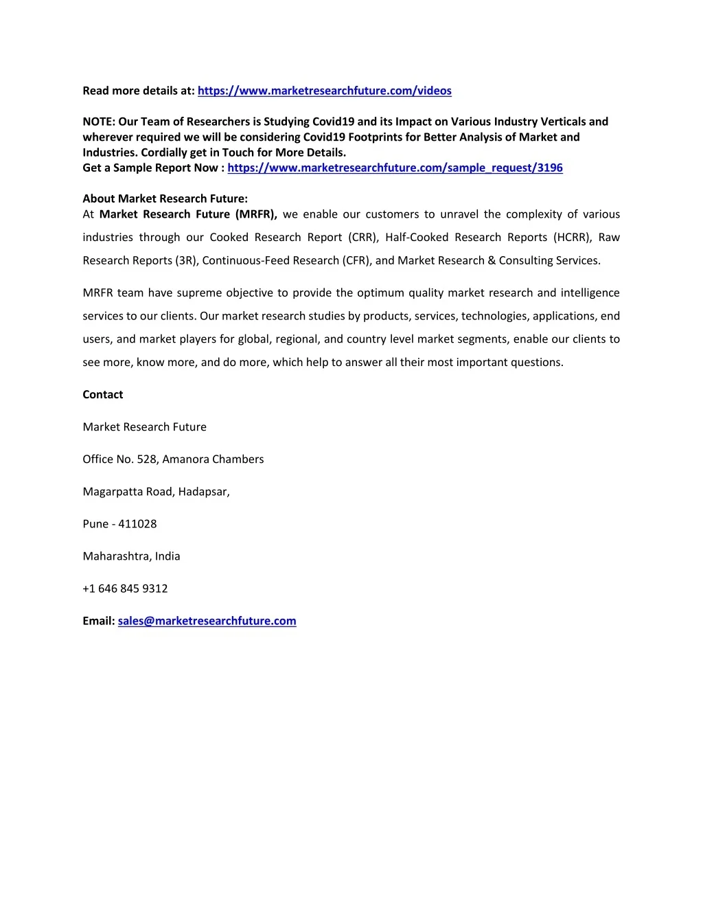 Read more details at: https://www.marketresearchfuture.com/videos NOTE: Our Team of Researchers is Studying Covid19 and its Impact on Various Industry Verticals and wherever required we will be considering Covid19 Footprints for Better Analysis of Market and Industries. Cordially get in Touch for More Details. Get a Sample Report Now :https://www.marketresearchfuture.com/sample_request/3196 About Market Research Future: At Market Research Future (MRFR), we enable our customers to unravel the complexity of various industries through our Cooked Research Report (CRR), Half-Cooked Research Reports (HCRR), Raw Research Reports (3R), Continuous-Feed Research (CFR), and Market Research & Consulting Services. MRFR team have supreme objective to provide the optimum quality market research and intelligence services to our clients. Our market research studies by products, services, technologies, applications, end users, and market players for global, regional, and country level market segments, enable our clients to see more, know more, and do more, which help to answer all their most important questions. Contact Market Research Future Office No. 528, Amanora Chambers Magarpatta Road, Hadapsar, Pune - 411028 Maharashtra, India +1 646 845 9312 Email: sales@marketresearchfuture.com