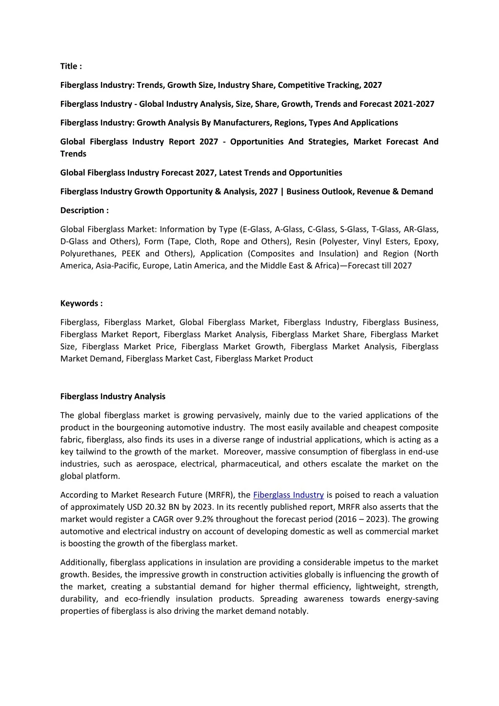 Title : Fiberglass Industry: Trends, Growth Size, Industry Share, Competitive Tracking, 2027 Fiberglass Industry - Global Industry Analysis, Size, Share, Growth, Trends and Forecast 2021-2027 Fiberglass Industry: Growth Analysis By Manufacturers, Regions, Types And Applications Global Fiberglass Industry Report 2027 - Opportunities And Strategies, Market Forecast And Trends Global Fiberglass Industry Forecast 2027, Latest Trends and Opportunities Fiberglass Industry Growth Opportunity & Analysis, 2027 | Business Outlook, Revenue & Demand Description : Global Fiberglass Market: Information by Type (E-Glass, A-Glass, C-Glass, S-Glass, T-Glass, AR-Glass, D-Glass and Others), Form (Tape, Cloth, Rope and Others), Resin (Polyester, Vinyl Esters, Epoxy, Polyurethanes, PEEK and Others), Application (Composites and Insulation) and Region (North America, Asia-Pacific, Europe, Latin America, and the Middle East & Africa)—Forecast till 2027 Keywords : Fiberglass, Fiberglass Market, Global Fiberglass Market, Fiberglass Industry, Fiberglass Business, Fiberglass Market Report, Fiberglass Market Analysis, Fiberglass Market Share, Fiberglass Market Size, Fiberglass Market Price, Fiberglass Market Growth, Fiberglass Market Analysis, Fiberglass Market Demand, Fiberglass Market Cast, Fiberglass Market Product Fiberglass Industry Analysis The global fiberglass market is growing pervasively, mainly due to the varied applications of the product in the bourgeoning automotive industry. The most easily available and cheapest composite fabric, fiberglass, also finds its uses in a diverse range of industrial applications, which is acting as a key tailwind to the growth of the market. Moreover, massive consumption of fiberglass in end-use industries, such as aerospace, electrical, pharmaceutical, and others escalate the market on the global platform. According to Market Research Future (MRFR), the Fiberglass Industry is poised to reach a valuation of approximately USD 20.32 BN by 2023. In its recently published report, MRFR also asserts that the market would register a CAGR over 9.2% throughout the forecast period (2016 – 2023). The growing automotive and electrical industry on account of developing domestic as well as commercial market is boosting the growth of the fiberglass market. Additionally, fiberglass applications in insulation are providing a considerable impetus to the market growth. Besides, the impressive growth in construction activities globally is influencing the growth of the market, creating a substantial demand for higher thermal efficiency, lightweight, strength, durability, and eco-friendly insulation products. Spreading awareness towards energy-saving properties of fiberglass is also driving the market demand notably.