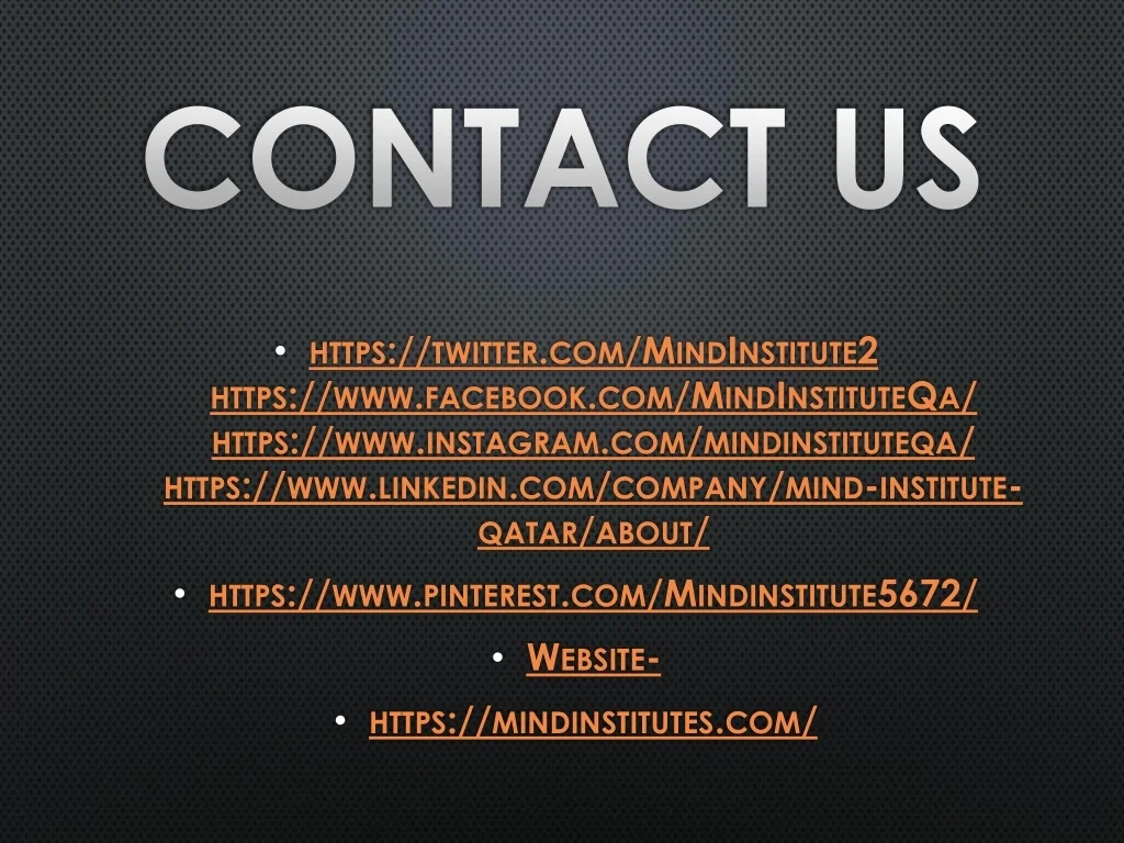 • HTTPS://TWITTER.COM/MINDINSTITUTE2 HTTPS://WWW.FACEBOOK.COM/MINDINSTITUTEQA/ HTTPS://WWW.INSTAGRAM.COM/MINDINSTITUTEQA/ HTTPS://WWW.LINKEDIN.COM/COMPANY/MIND-INSTITUTE- QATAR/ABOUT/ • HTTPS://WWW.PINTEREST.COM/MINDINSTITUTE5672/ • WEBSITE- • HTTPS://MINDINSTITUTES.COM/