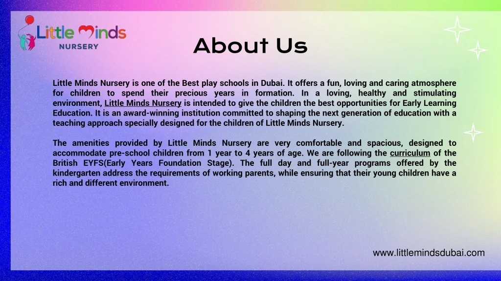 About Us Little Minds Nursery is one of the Best play schools in Dubai. It offers a fun, loving and caring atmosphere for children to spend their precious years in formation. In a loving, healthy and stimulating environment, Little Minds Nursery is intended to give the children the best opportunities for Early Learning Education. It is an award-winning institution committed to shaping the next generation of education with a teaching approach specially designed for the children of Little Minds Nursery. The amenities provided by Little Minds Nursery are very comfortable and spacious, designed to accommodate pre-school children from 1 year to 4 years of age. We are following the curriculum of the British EYFS(Early Years Foundation Stage). The full day and full-year programs offered by the kindergarten address the requirements of working parents, while ensuring that their young children have a rich and different environment. www.littlemindsdubai.com