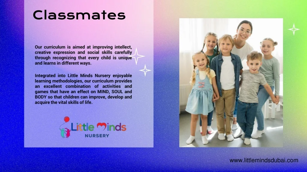 Classmates Our curriculum is aimed at improving intellect, creative expression and social skills carefully through recognizing that every child is unique and learns in different ways. Integrated into Little Minds Nursery enjoyable learning methodologies, our curriculum provides an excellent combination of activities and games that have an effect on MIND, SOUL and BODY so that children can improve, develop and acquire the vital skills of life. www.littlemindsdubai.com