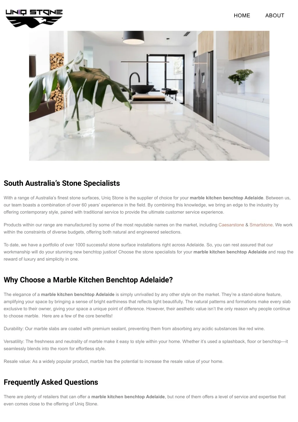 HOME ABOUT South Australia’s Stone Specialists With a range of Australia’s finest stone surfaces, Uniq Stone is the supplier of choice for your marble kitchen benchtop Adelaide. Between us, our team boasts a combination of over 60 years’ experience in the field. By combining this knowledge, we bring an edge to the industry by offering contemporary style, paired with traditional service to provide the ultimate customer service experience. Products within our range are manufactured by some of the most reputable names on the market, including Caesarstone & Smartstone. We work within the constraints of diverse budgets, offering both natural and engineered selections. To date, we have a portfolio of over 1000 successful stone surface installations right across Adelaide. So, you can rest assured that our workmanship will do your stunning new benchtop justice! Choose the stone specialists for your marble kitchen benchtopAdelaide and reap the reward of luxury and simplicity in one. Why Choose a Marble Kitchen Benchtop Adelaide? The elegance of a marble kitchen benchtop Adelaide is simply unrivalled by any other style on the market. They’re a stand-alone feature, amplifying your space by bringing a sense of bright earthiness that reflects light beautifully. The natural patterns and formations make every slab exclusive to their owner, giving your space a unique point of difference. However, their aesthetic value isn’t the only reason why people continue to choose marble. Here are a few of the core benefits! Durability: Our marble slabs are coated with premium sealant, preventing them from absorbing any acidic substances like red wine. Versatility: The freshness and neutrality of marble make it easy to style within your home. Whether it’s used a splashback, floor or benchtop—it seamlessly blends into the room for effortless style. Resale value: As a widely popular product, marble has the potential to increase the resale value of your home. Frequently Asked Questions There are plenty of retailers that can offer a marble kitchen benchtop Adelaide, but none of them offers a level of service and expertise that even comes close to the offering of Uniq Stone.