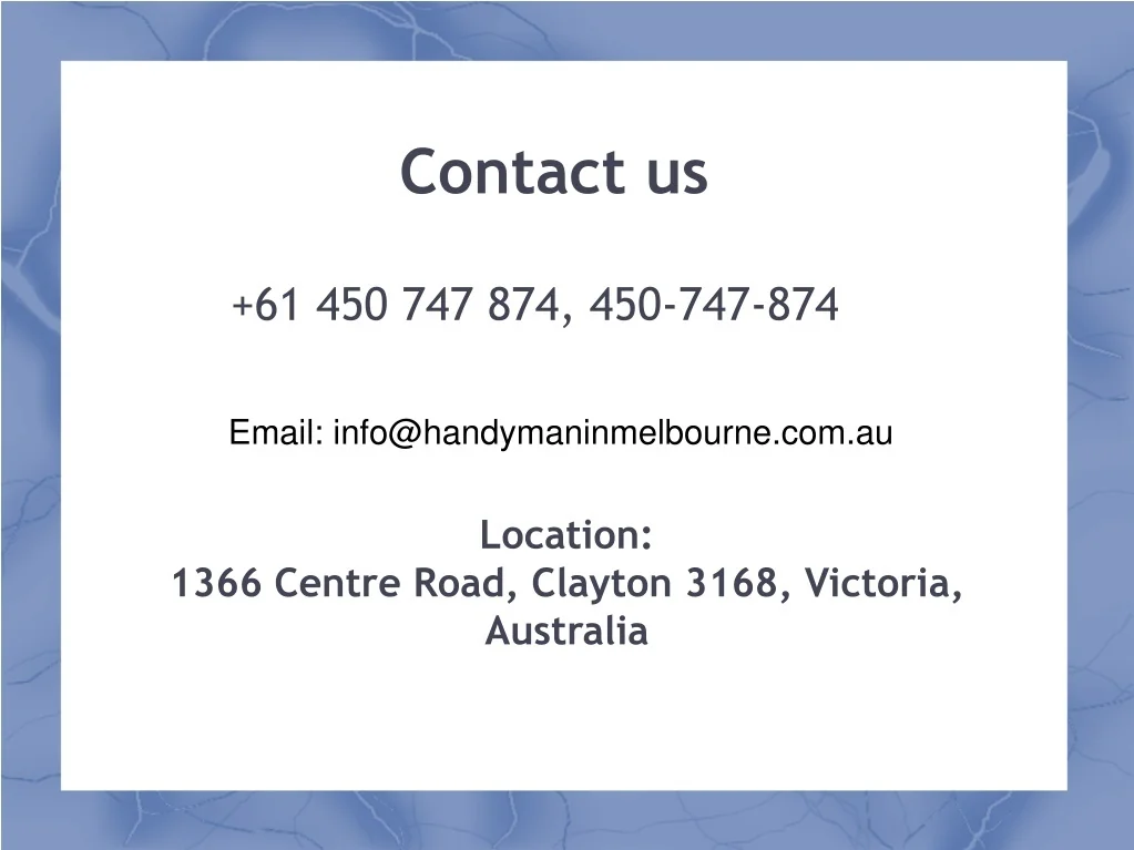 Contact us +61 450 747 874, 450-747-874 Email: info@handymaninmelbourne.com.au Location: 1366 Centre Road, Clayton 3168, Victoria, Australia