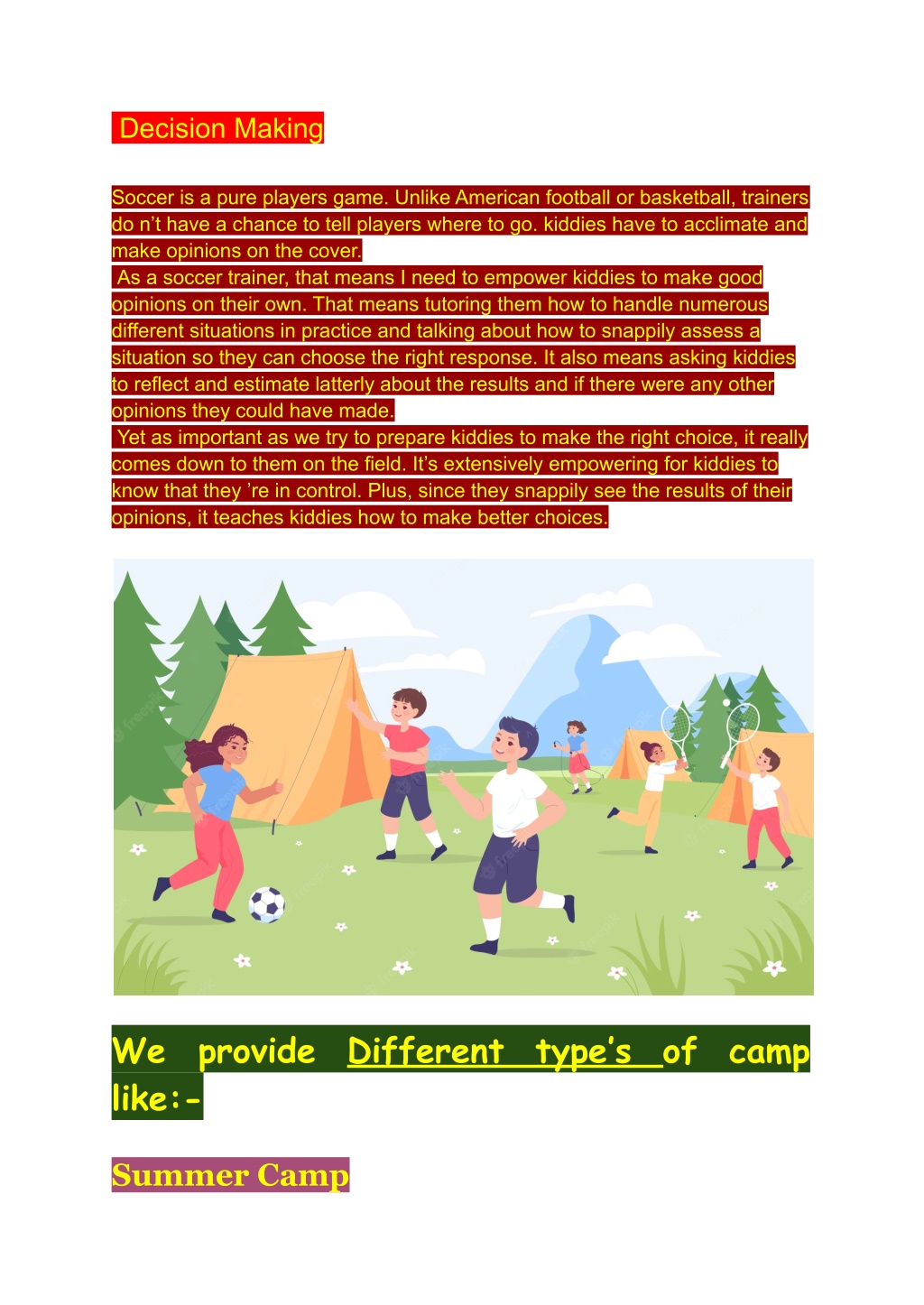 Decision Making Soccer is a pure players game. Unlike American football or basketball, trainers do n’t have a chance to tell players where to go. kiddies have to acclimate and make opinions on the cover. As a soccer trainer, that means I need to empower kiddies to make good opinions on their own. That means tutoring them how to handle numerous different situations in practice and talking about how to snappily assess a situation so they can choose the right response. It also means asking kiddies to reflect and estimate latterly about the results and if there were any other opinions they could have made. Yet as important as we try to prepare kiddies to make the right choice, it really comes down to them on the field. It’s extensively empowering for kiddies to know that they ’re in control. Plus, since they snappily see the results of their opinions, it teaches kiddies how to make better choices. We like:- provide Different type’s of camp Summer Camp