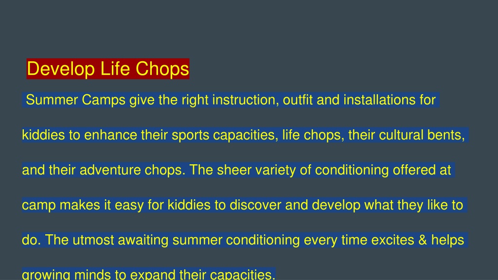Develop Life Chops Summer Camps give the right instruction, outfit and installations for kiddies to enhance their sports capacities, life chops, their cultural bents, and their adventure chops. The sheer variety of conditioning offered at camp makes it easy for kiddies to discover and develop what they like to do. The utmost awaiting summer conditioning every time excites & helps growing minds to expand their capacities.