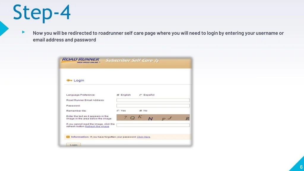 Step-4 ▸ Now you will be redirected to roadrunner self care page where you will need to login by entering your username or email address and password 6