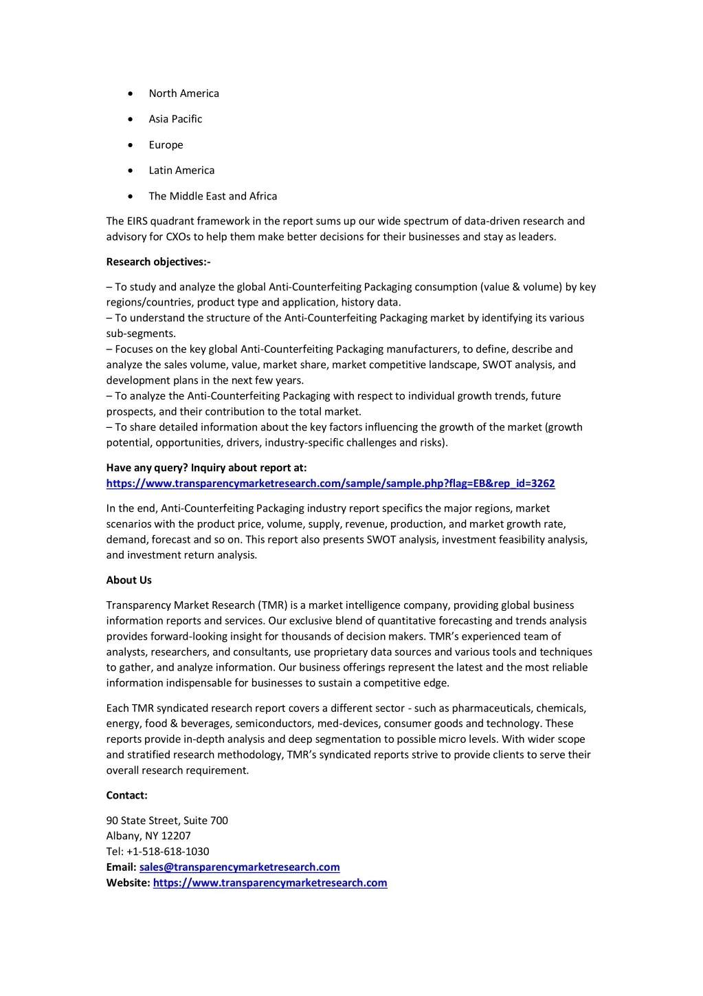 North America Asia Pacific Europe Latin America The Middle East and Africa The EIRS quadrant framework in the report sums up our wide spectrum of data-driven research and advisory for CXOs to help them make better decisions for their businesses and stay as leaders. Research objectives:- – To study and analyze the global Anti-Counterfeiting Packaging consumption (value & volume) by key regions/countries, product type and application, history data. – To understand the structure of the Anti-Counterfeiting Packaging market by identifying its various sub-segments. – Focuses on the key global Anti-Counterfeiting Packaging manufacturers, to define, describe and analyze the sales volume, value, market share, market competitive landscape, SWOT analysis, and development plans in the next few years. – To analyze the Anti-Counterfeiting Packaging with respect to individual growth trends, future prospects, and their contribution to the total market. – To share detailed information about the key factors influencing the growth of the market (growth potential, opportunities, drivers, industry-specific challenges and risks). Have any query? Inquiry about report at: https://www.transparencymarketresearch.com/sample/sample.php?flag=EB&rep_id=3262 In the end, Anti-Counterfeiting Packaging industry report specifics the major regions, market scenarios with the product price, volume, supply, revenue, production, and market growth rate, demand, forecast and so on. This report also presents SWOT analysis, investment feasibility analysis, and investment return analysis. About Us Transparency Market Research (TMR) is a market intelligence company, providing global business information reports and services. Our exclusive blend of quantitative forecasting and trends analysis provides forward-looking insight for thousands of decision makers. TMR’s experienced team of analysts, researchers, and consultants, use proprietary data sources and various tools and techniques to gather, and analyze information. Our business offerings represent the latest and the most reliable information indispensable for businesses to sustain a competitive edge. Each TMR syndicated research report covers a different sector - such as pharmaceuticals, chemicals, energy, food & beverages, semiconductors, med-devices, consumer goods and technology. These reports provide in-depth analysis and deep segmentation to possible micro levels. With wider scope and stratified research methodology, TMR’s syndicated reports strive to provide clients to serve their overall research requirement. Contact: 90 State Street, Suite 700 Albany, NY 12207 Tel: +1-518-618-1030 Email: sales@transparencymarketresearch.com Website: https://www.transparencymarketresearch.com