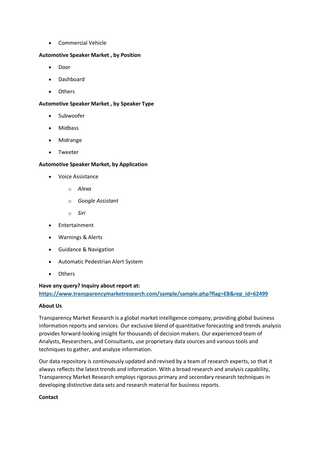 Commercial Vehicle Automotive Speaker Market , by Position Door Dashboard Others Automotive Speaker Market , by Speaker Type Subwoofer Midbass Midrange Tweeter Automotive Speaker Market, by Application Voice Assistance oAlexa oGoogle Assistant oSiri Entertainment Warnings & Alerts Guidance & Navigation Automatic Pedestrian Alert System Others Have any query? Inquiry about report at: https://www.transparencymarketresearch.com/sample/sample.php?flag=EB&rep_id=62499 About Us Transparency Market Research is a global market intelligence company, providing global business information reports and services. Our exclusive blend of quantitative forecasting and trends analysis provides forward-looking insight for thousands of decision makers. Our experienced team of Analysts, Researchers, and Consultants, use proprietary data sources and various tools and techniques to gather, and analyze information. Our data repository is continuously updated and revised by a team of research experts, so that it always reflects the latest trends and information. With a broad research and analysis capability, Transparency Market Research employs rigorous primary and secondary research techniques in developing distinctive data sets and research material for business reports. Contact