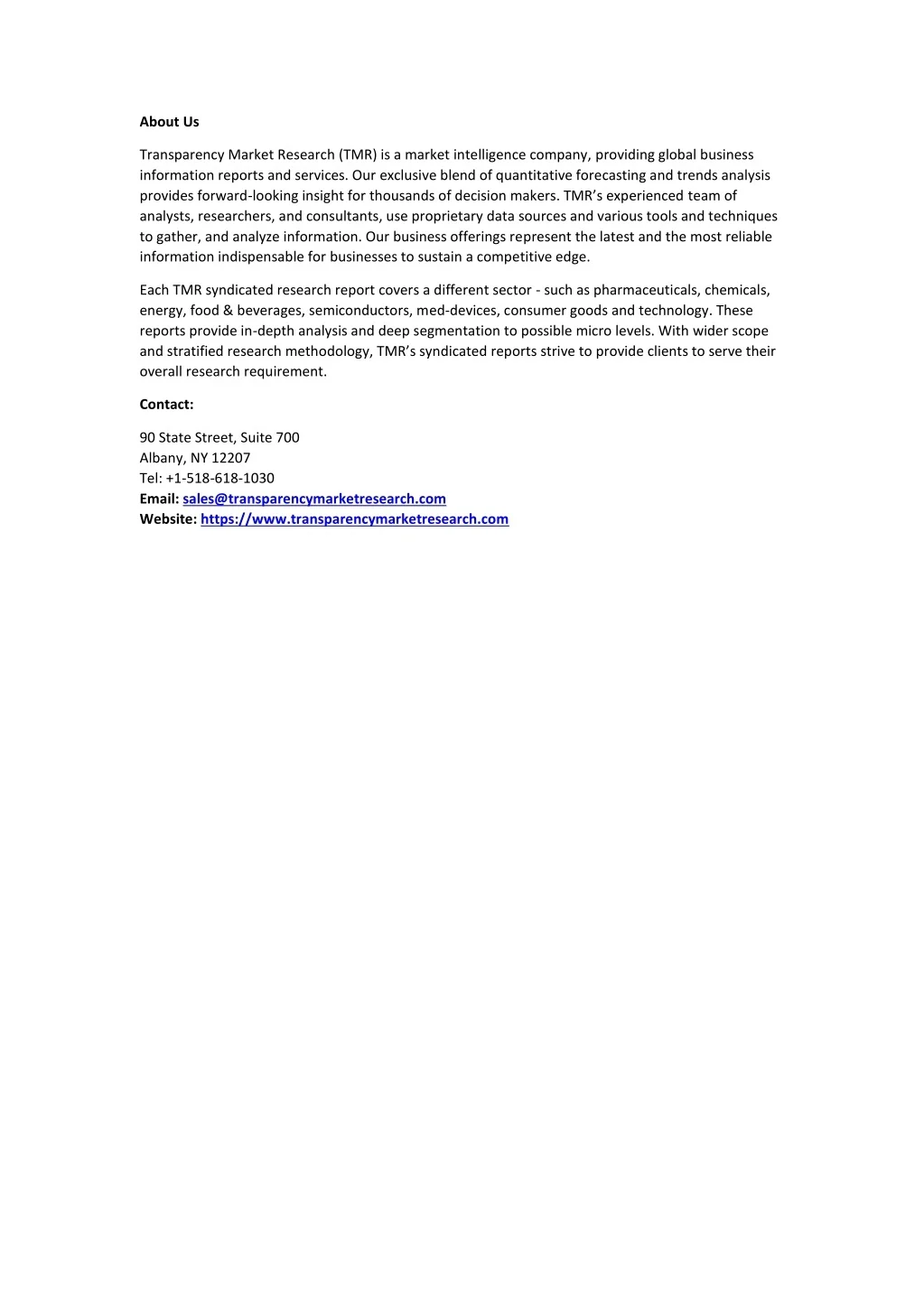 About Us Transparency Market Research (TMR) is a market intelligence company, providing global business information reports and services. Our exclusive blend of quantitative forecasting and trends analysis provides forward-looking insight for thousands of decision makers. TMR’s experienced team of analysts, researchers, and consultants, use proprietary data sources and various tools and techniques to gather, and analyze information. Our business offerings represent the latest and the most reliable information indispensable for businesses to sustain a competitive edge. Each TMR syndicated research report covers a different sector - such as pharmaceuticals, chemicals, energy, food & beverages, semiconductors, med-devices, consumer goods and technology. These reports provide in-depth analysis and deep segmentation to possible micro levels. With wider scope and stratified research methodology, TMR’s syndicated reports strive to provide clients to serve their overall research requirement. Contact: 90 State Street, Suite 700 Albany, NY 12207 Tel: +1-518-618-1030 Email: sales@transparencymarketresearch.com Website: https://www.transparencymarketresearch.com