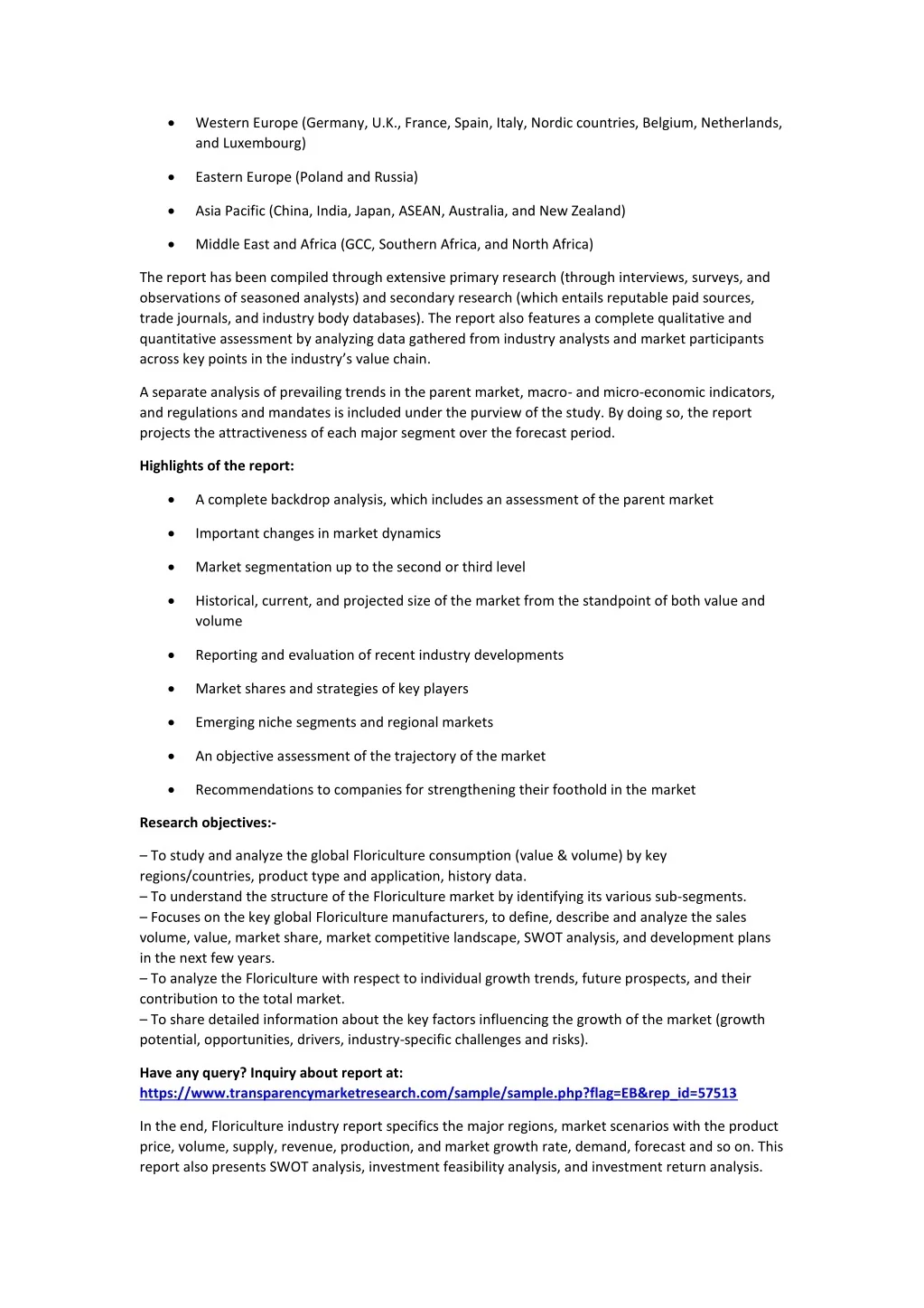 Western Europe (Germany, U.K., France, Spain, Italy, Nordic countries, Belgium, Netherlands, and Luxembourg) Eastern Europe (Poland and Russia) Asia Pacific (China, India, Japan, ASEAN, Australia, and New Zealand) Middle East and Africa (GCC, Southern Africa, and North Africa) The report has been compiled through extensive primary research (through interviews, surveys, and observations of seasoned analysts) and secondary research (which entails reputable paid sources, trade journals, and industry body databases). The report also features a complete qualitative and quantitative assessment by analyzing data gathered from industry analysts and market participants across key points in the industry’s value chain. A separate analysis of prevailing trends in the parent market, macro- and micro-economic indicators, and regulations and mandates is included under the purview of the study. By doing so, the report projects the attractiveness of each major segment over the forecast period. Highlights of the report: A complete backdrop analysis, which includes an assessment of the parent market Important changes in market dynamics Market segmentation up to the second or third level Historical, current, and projected size of the market from the standpoint of both value and volume Reporting and evaluation of recent industry developments Market shares and strategies of key players Emerging niche segments and regional markets An objective assessment of the trajectory of the market Recommendations to companies for strengthening their foothold in the market Research objectives:- – To study and analyze the global Floriculture consumption (value & volume) by key regions/countries, product type and application, history data. – To understand the structure of the Floriculture market by identifying its various sub-segments. – Focuses on the key global Floriculture manufacturers, to define, describe and analyze the sales volume, value, market share, market competitive landscape, SWOT analysis, and development plans in the next few years. – To analyze the Floriculture with respect to individual growth trends, future prospects, and their contribution to the total market. – To share detailed information about the key factors influencing the growth of the market (growth potential, opportunities, drivers, industry-specific challenges and risks). Have any query? Inquiry about report at: https://www.transparencymarketresearch.com/sample/sample.php?flag=EB&rep_id=57513 In the end, Floriculture industry report specifics the major regions, market scenarios with the product price, volume, supply, revenue, production, and market growth rate, demand, forecast and so on. This report also presents SWOT analysis, investment feasibility analysis, and investment return analysis.