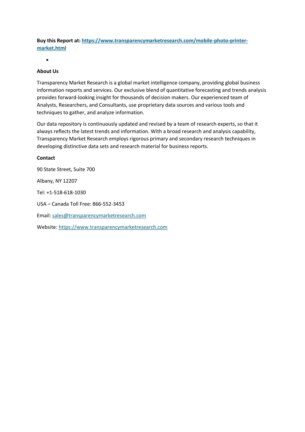 Buy this Report at: https://www.transparencymarketresearch.com/mobile-photo-printer- market.html About Us Transparency Market Research is a global market intelligence company, providing global business information reports and services. Our exclusive blend of quantitative forecasting and trends analysis provides forward-looking insight for thousands of decision makers. Our experienced team of Analysts, Researchers, and Consultants, use proprietary data sources and various tools and techniques to gather, and analyze information. Our data repository is continuously updated and revised by a team of research experts, so that it always reflects the latest trends and information. With a broad research and analysis capability, Transparency Market Research employs rigorous primary and secondary research techniques in developing distinctive data sets and research material for business reports. Contact 90 State Street, Suite 700 Albany, NY 12207 Tel: +1-518-618-1030 USA – Canada Toll Free: 866-552-3453 Email: sales@transparencymarketresearch.com Website: https://www.transparencymarketresearch.com