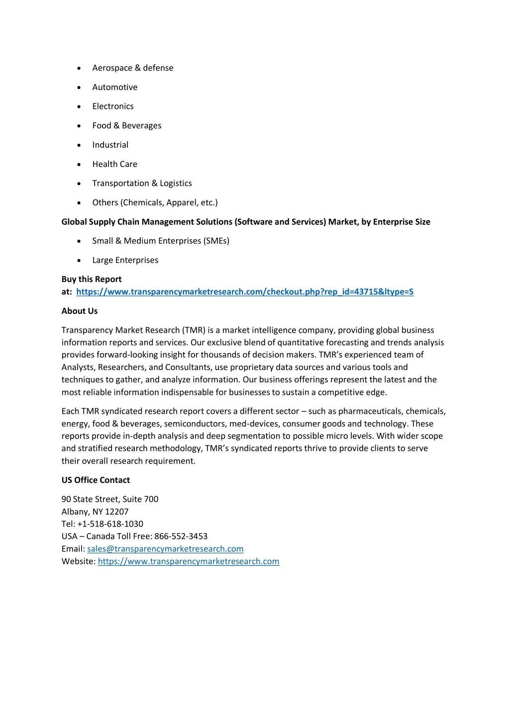 Aerospace & defense Automotive Electronics Food & Beverages Industrial Health Care Transportation & Logistics Others (Chemicals, Apparel, etc.) Global Supply Chain Management Solutions (Software and Services) Market, by Enterprise Size Small & Medium Enterprises (SMEs) Large Enterprises Buy this Report at: https://www.transparencymarketresearch.com/checkout.php?rep_id=43715<ype=S About Us Transparency Market Research (TMR) is a market intelligence company, providing global business information reports and services. Our exclusive blend of quantitative forecasting and trends analysis provides forward-looking insight for thousands of decision makers. TMR’s experienced team of Analysts, Researchers, and Consultants, use proprietary data sources and various tools and techniques to gather, and analyze information. Our business offerings represent the latest and the most reliable information indispensable for businesses to sustain a competitive edge. Each TMR syndicated research report covers a different sector – such as pharmaceuticals, chemicals, energy, food & beverages, semiconductors, med-devices, consumer goods and technology. These reports provide in-depth analysis and deep segmentation to possible micro levels. With wider scope and stratified research methodology, TMR’s syndicated reports thrive to provide clients to serve their overall research requirement. US Office Contact 90 State Street, Suite 700 Albany, NY 12207 Tel: +1-518-618-1030 USA – Canada Toll Free: 866-552-3453 Email: sales@transparencymarketresearch.com Website: https://www.transparencymarketresearch.com