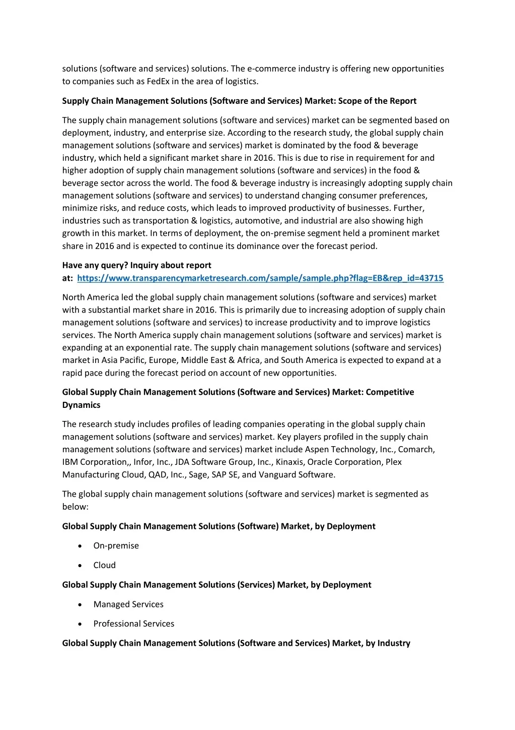 solutions (software and services) solutions. The e-commerce industry is offering new opportunities to companies such as FedEx in the area of logistics. Supply Chain Management Solutions (Software and Services) Market: Scope of the Report The supply chain management solutions (software and services) market can be segmented based on deployment, industry, and enterprise size. According to the research study, the global supply chain management solutions (software and services) market is dominated by the food & beverage industry, which held a significant market share in 2016. This is due to rise in requirement for and higher adoption of supply chain management solutions (software and services) in the food & beverage sector across the world. The food & beverage industry is increasingly adopting supply chain management solutions (software and services) to understand changing consumer preferences, minimize risks, and reduce costs, which leads to improved productivity of businesses. Further, industries such as transportation & logistics, automotive, and industrial are also showing high growth in this market. In terms of deployment, the on-premise segment held a prominent market share in 2016 and is expected to continue its dominance over the forecast period. Have any query? Inquiry about report at: https://www.transparencymarketresearch.com/sample/sample.php?flag=EB&rep_id=43715 North America led the global supply chain management solutions (software and services) market with a substantial market share in 2016. This is primarily due to increasing adoption of supply chain management solutions (software and services) to increase productivity and to improve logistics services. The North America supply chain management solutions (software and services) market is expanding at an exponential rate. The supply chain management solutions (software and services) market in Asia Pacific, Europe, Middle East & Africa, and South America is expected to expand at a rapid pace during the forecast period on account of new opportunities. Global Supply Chain Management Solutions (Software and Services) Market: Competitive Dynamics The research study includes profiles of leading companies operating in the global supply chain management solutions (software and services) market. Key players profiled in the supply chain management solutions (software and services) market include Aspen Technology, Inc., Comarch, IBM Corporation,, Infor, Inc., JDA Software Group, Inc., Kinaxis, Oracle Corporation, Plex Manufacturing Cloud, QAD, Inc., Sage, SAP SE, and Vanguard Software. The global supply chain management solutions (software and services) market is segmented as below: Global Supply Chain Management Solutions (Software) Market, by Deployment On-premise Cloud Global Supply Chain Management Solutions (Services) Market, by Deployment Managed Services Professional Services Global Supply Chain Management Solutions (Software and Services) Market, by Industry