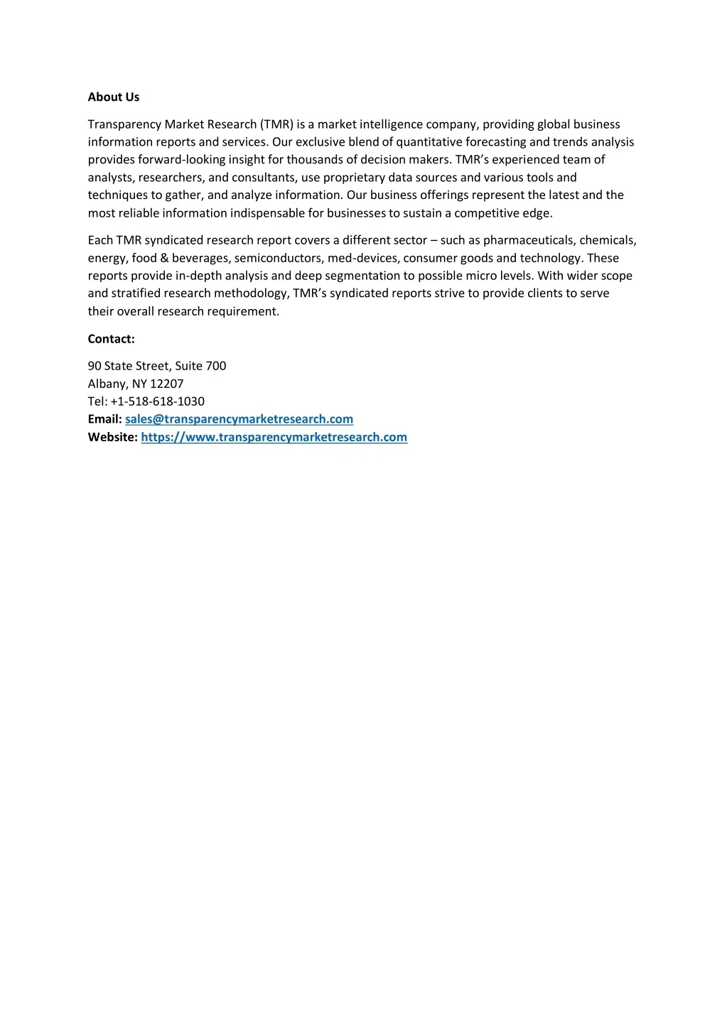 About Us Transparency Market Research (TMR) is a market intelligence company, providing global business information reports and services. Our exclusive blend of quantitative forecasting and trends analysis provides forward-looking insight for thousands of decision makers. TMR’s experienced team of analysts, researchers, and consultants, use proprietary data sources and various tools and techniques to gather, and analyze information. Our business offerings represent the latest and the most reliable information indispensable for businesses to sustain a competitive edge. Each TMR syndicated research report covers a different sector – such as pharmaceuticals, chemicals, energy, food & beverages, semiconductors, med-devices, consumer goods and technology. These reports provide in-depth analysis and deep segmentation to possible micro levels. With wider scope and stratified research methodology, TMR’s syndicated reports strive to provide clients to serve their overall research requirement. Contact: 90 State Street, Suite 700 Albany, NY 12207 Tel: +1-518-618-1030 Email: sales@transparencymarketresearch.com Website: https://www.transparencymarketresearch.com