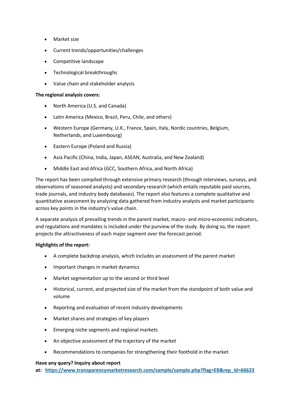 Market size Current trends/opportunities/challenges Competitive landscape Technological breakthroughs Value chain and stakeholder analysis The regional analysis covers: North America (U.S. and Canada) Latin America (Mexico, Brazil, Peru, Chile, and others) Western Europe (Germany, U.K., France, Spain, Italy, Nordic countries, Belgium, Netherlands, and Luxembourg) Eastern Europe (Poland and Russia) Asia Pacific (China, India, Japan, ASEAN, Australia, and New Zealand) Middle East and Africa (GCC, Southern Africa, and North Africa) The report has been compiled through extensive primary research (through interviews, surveys, and observations of seasoned analysts) and secondary research (which entails reputable paid sources, trade journals, and industry body databases). The report also features a complete qualitative and quantitative assessment by analyzing data gathered from industry analysts and market participants across key points in the industry’s value chain. A separate analysis of prevailing trends in the parent market, macro- and micro-economic indicators, and regulations and mandates is included under the purview of the study. By doing so, the report projects the attractiveness of each major segment over the forecast period. Highlights of the report: A complete backdrop analysis, which includes an assessment of the parent market Important changes in market dynamics Market segmentation up to the second or third level Historical, current, and projected size of the market from the standpoint of both value and volume Reporting and evaluation of recent industry developments Market shares and strategies of key players Emerging niche segments and regional markets An objective assessment of the trajectory of the market Recommendations to companies for strengthening their foothold in the market Have any query? Inquiry about report at: https://www.transparencymarketresearch.com/sample/sample.php?flag=EB&rep_id=66623