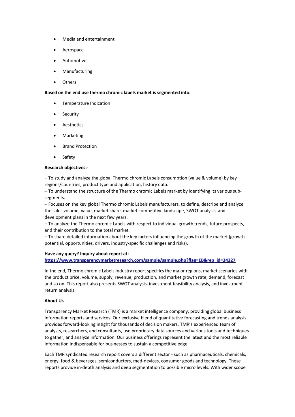 Media and entertainment Aerospace Automotive Manufacturing Others Based on the end use thermo chromic labels market is segmented into: Temperature Indication Security Aesthetics Marketing Brand Protection Safety Research objectives:- – To study and analyze the global Thermo chromic Labels consumption (value & volume) by key regions/countries, product type and application, history data. – To understand the structure of the Thermo chromic Labels market by identifying its various sub- segments. – Focuses on the key global Thermo chromic Labels manufacturers, to define, describe and analyze the sales volume, value, market share, market competitive landscape, SWOT analysis, and development plans in the next few years. – To analyze the Thermo chromic Labels with respect to individual growth trends, future prospects, and their contribution to the total market. – To share detailed information about the key factors influencing the growth of the market (growth potential, opportunities, drivers, industry-specific challenges and risks). Have any query? Inquiry about report at: https://www.transparencymarketresearch.com/sample/sample.php?flag=EB&rep_id=24227 In the end, Thermo chromic Labels industry report specifics the major regions, market scenarios with the product price, volume, supply, revenue, production, and market growth rate, demand, forecast and so on. This report also presents SWOT analysis, investment feasibility analysis, and investment return analysis. About Us Transparency Market Research (TMR) is a market intelligence company, providing global business information reports and services. Our exclusive blend of quantitative forecasting and trends analysis provides forward-looking insight for thousands of decision makers. TMR’s experienced team of analysts, researchers, and consultants, use proprietary data sources and various tools and techniques to gather, and analyze information. Our business offerings represent the latest and the most reliable information indispensable for businesses to sustain a competitive edge. Each TMR syndicated research report covers a different sector - such as pharmaceuticals, chemicals, energy, food & beverages, semiconductors, med-devices, consumer goods and technology. These reports provide in-depth analysis and deep segmentation to possible micro levels. With wider scope