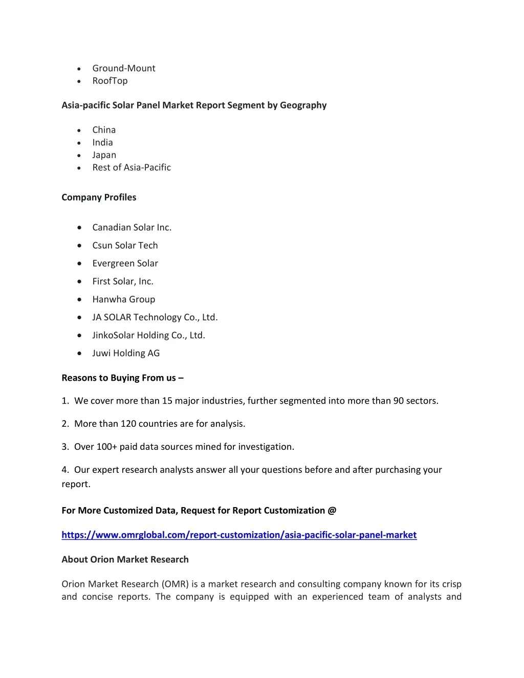 Ground-Mount RoofTop Asia-pacific Solar Panel Market Report Segment by Geography China India Japan Rest of Asia-Pacific Company Profiles Canadian Solar Inc. Csun Solar Tech Evergreen Solar First Solar, Inc. Hanwha Group JA SOLAR Technology Co., Ltd. JinkoSolar Holding Co., Ltd. Juwi Holding AG Reasons to Buying From us – 1. We cover more than 15 major industries, further segmented into more than 90 sectors. 2. More than 120 countries are for analysis. 3. Over 100+ paid data sources mined for investigation. 4. Our expert research analysts answer all your questions before and after purchasing your report. For More Customized Data, Request for Report Customization @ https://www.omrglobal.com/report-customization/asia-pacific-solar-panel-market About Orion Market Research Orion Market Research (OMR) is a market research and consulting company known for its crisp and concise reports. The company is equipped with an experienced team of analysts and