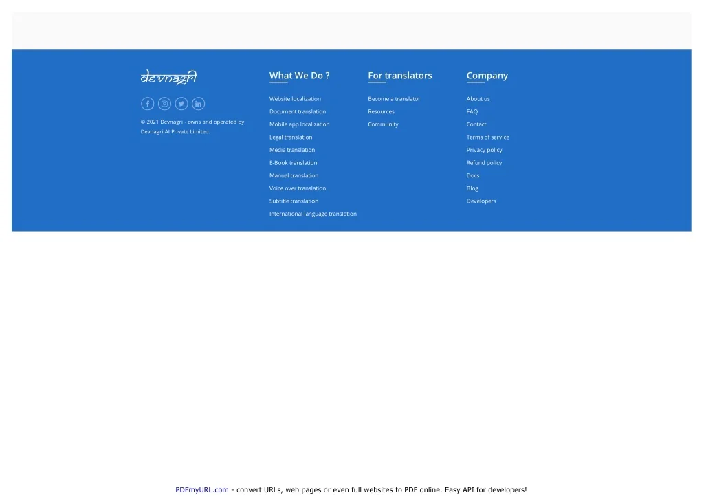 What We Do ? For translators Company Website localization Become a translator About us Document translation Resources FAQ © 2021 Devnagri - owns and operated by Devnagri AI Private Limited. Mobile app localization Community Contact Legal translation Terms of service Media translation Privacy policy E-Book translation Refund policy Manual translation Docs Voice over translation Blog Subtitle translation Developers International language translation PDFmyURL.com - convert URLs, web pages or even full websites to PDF online. Easy API for developers!