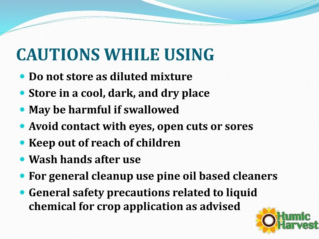 CAUTIONS WHILE USING • Do not store as diluted mixture • Store in a cool, dark, and dry place • May be harmful if swallowed • Avoid contact with eyes, open cuts or sores • Keep out of reach of children • Wash hands after use • For general cleanup use pine oil based cleaners • General safety precautions related to liquid chemical for crop application as advised