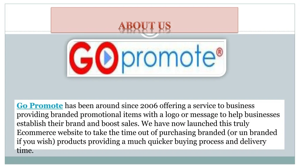 About Us Go Promote has been around since 2006 offering a service to business providing branded promotional items with a logo or message to help businesses establish their brand and boost sales. We have now launched this truly Ecommerce website to take the time out of purchasing branded (or un branded if you wish) products providing a much quicker buying process and delivery time.