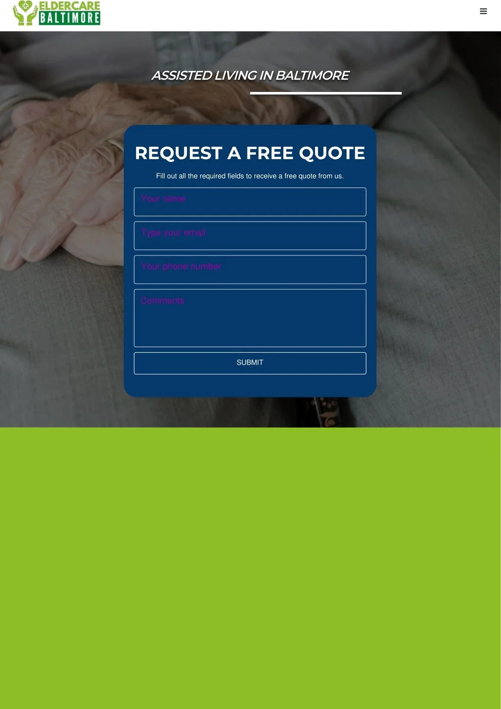 ASSISTED LIVING IN BALTIMORE REQUEST A FREE QUOTE Fill out all the required fields to receive a free quote from us. Your name Type your email Your phone number Comments SUBMIT