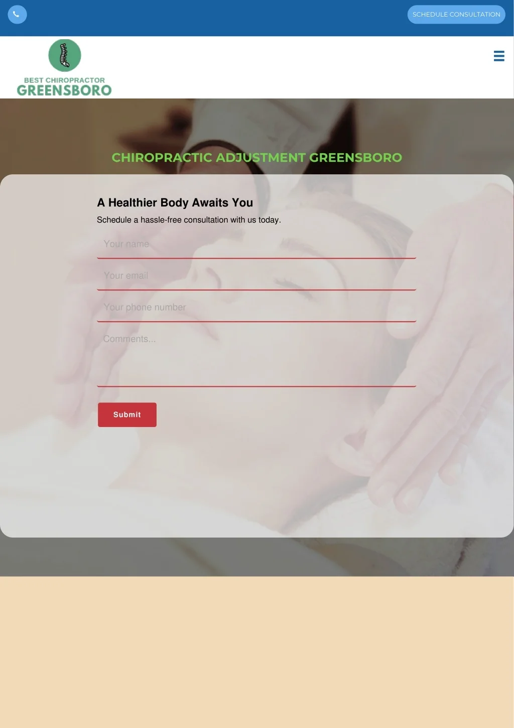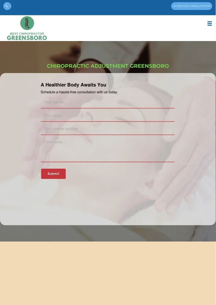SCHEDULE CONSULTATION CHIROPRACTIC ADJUSTMENT GREENSBORO A Healthier Body Awaits You Schedule a hassle-free consultation with us today. Your name Your email Your phone number Comments... Submit
