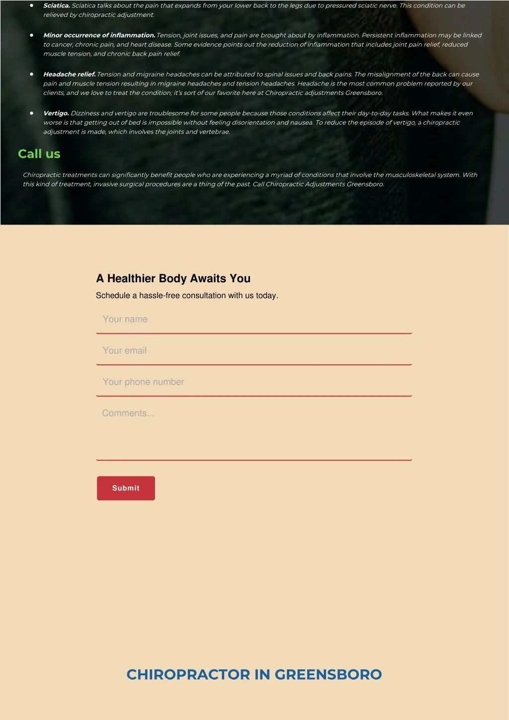 Sciatica. Sciatica talks about the pain that expands from your lower back to the legs due to pressured sciatic nerve. This condition can be relieved by chiropractic adjustment. Minor occurrence of inflammation. Tension, joint issues, and pain are brought about by inflammation. Persistent inflammation may be linked to cancer, chronic pain, and heart disease. Some evidence points out the reduction of inflammation that includes joint pain relief, reduced muscle tension, and chronic back pain relief. Headache relief. Tension and migraine headaches can be attributed to spinal issues and back pains. The misalignment of the back can cause pain and muscle tension resulting in migraine headaches and tension headaches. Headache is the most common problem reported by our clients, and we love to treat the condition; it’s sort of our favorite here at Chiropractic adjustments Greensboro. Vertigo. Dizziness and vertigo are troublesome for some people because those conditions affect their day-to-day tasks. What makes it even worse is that getting out of bed is impossible without feeling disorientation and nausea. To reduce the episode of vertigo, a chiropractic adjustment is made, which involves the joints and vertebrae. Call us Chiropractic treatments can significantly benefit people who are experiencing a myriad of conditions that involve the musculoskeletal system. With this kind of treatment, invasive surgical procedures are a thing of the past. Call Chiropractic Adjustments Greensboro. A Healthier Body Awaits You Schedule a hassle-free consultation with us today. Your name Your email Your phone number Comments... Submit CHIROPRACTOR IN GREENSBORO