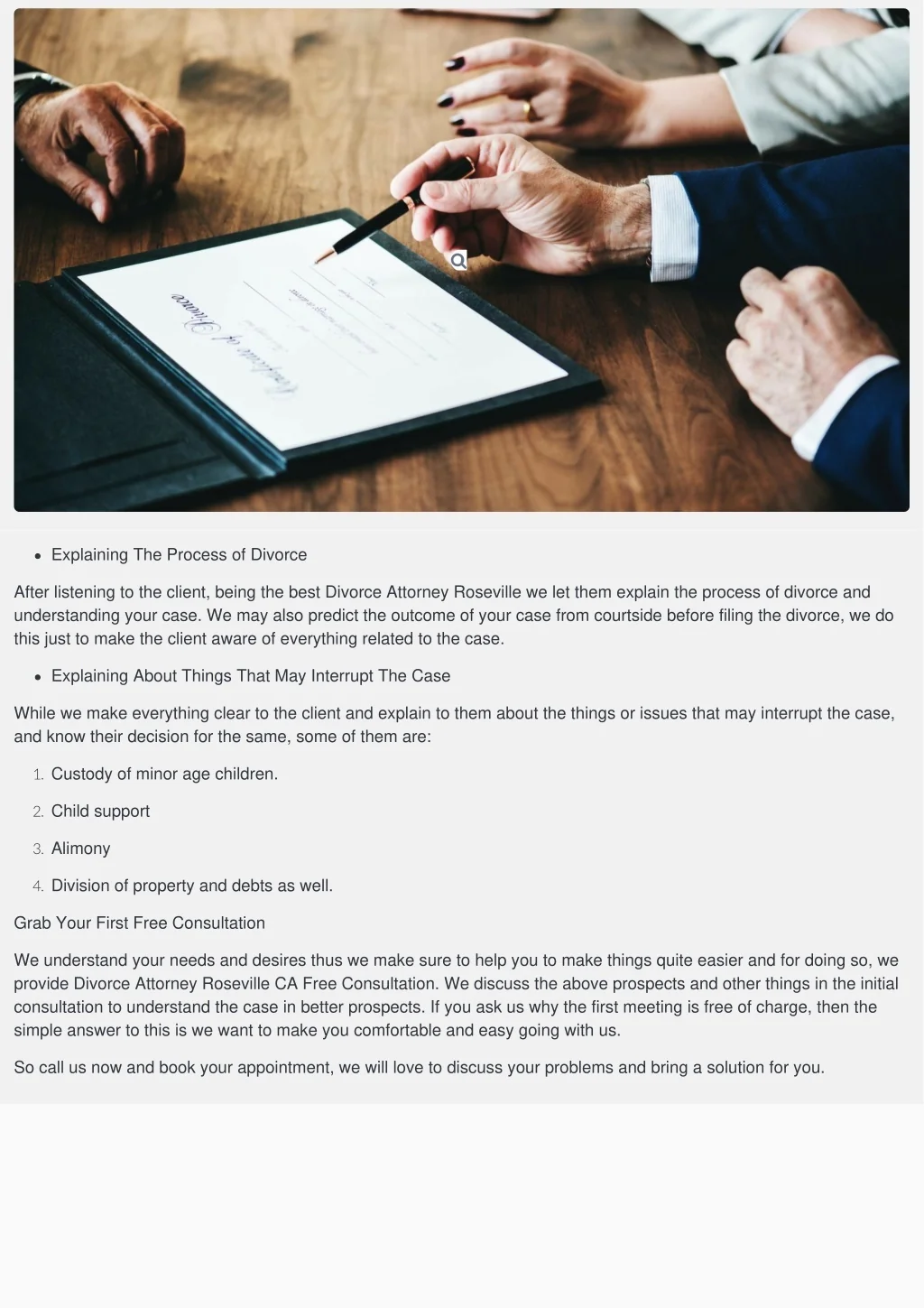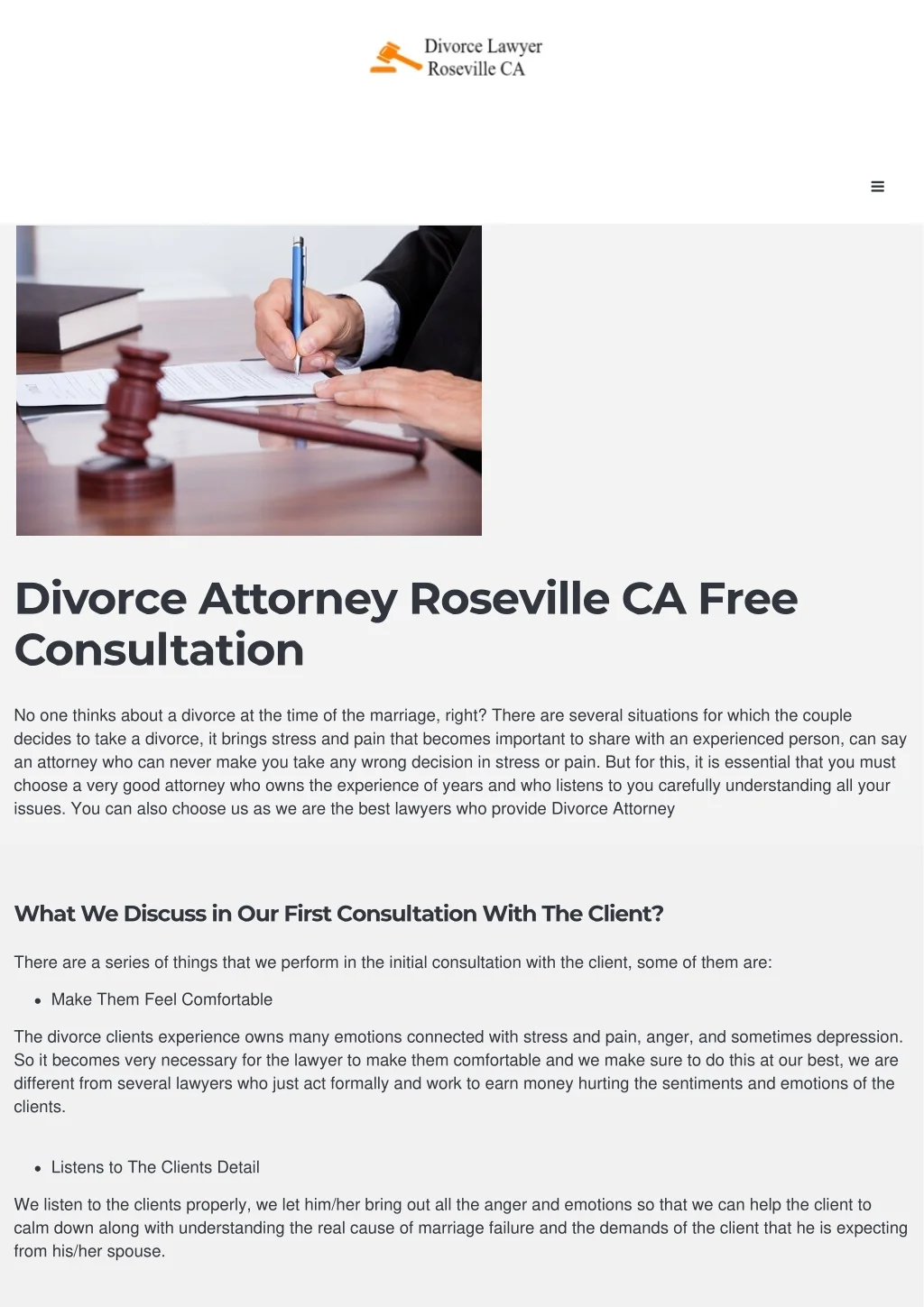 Divorce Attorney Roseville CA Free Consultation No one thinks about a divorce at the time of the marriage, right? There are several situations for which the couple decides to take a divorce, it brings stress and pain that becomes important to share with an experienced person, can say an attorney who can never make you take any wrong decision in stress or pain. But for this, it is essential that you must choose a very good attorney who owns the experience of years and who listens to you carefully understanding all your issues. You can also choose us as we are the best lawyers who provide Divorce Attorney What We Discuss in Our First Consultation With The Client? There are a series of things that we perform in the initial consultation with the client, some of them are: Make Them Feel Comfortable The divorce clients experience owns many emotions connected with stress and pain, anger, and sometimes depression. So it becomes very necessary for the lawyer to make them comfortable and we make sure to do this at our best, we are different from several lawyers who just act formally and work to earn money hurting the sentiments and emotions of the clients. Listens to The Clients Detail We listen to the clients properly, we let him/her bring out all the anger and emotions so that we can help the client to calm down along with understanding the real cause of marriage failure and the demands of the client that he is expecting from his/her spouse.