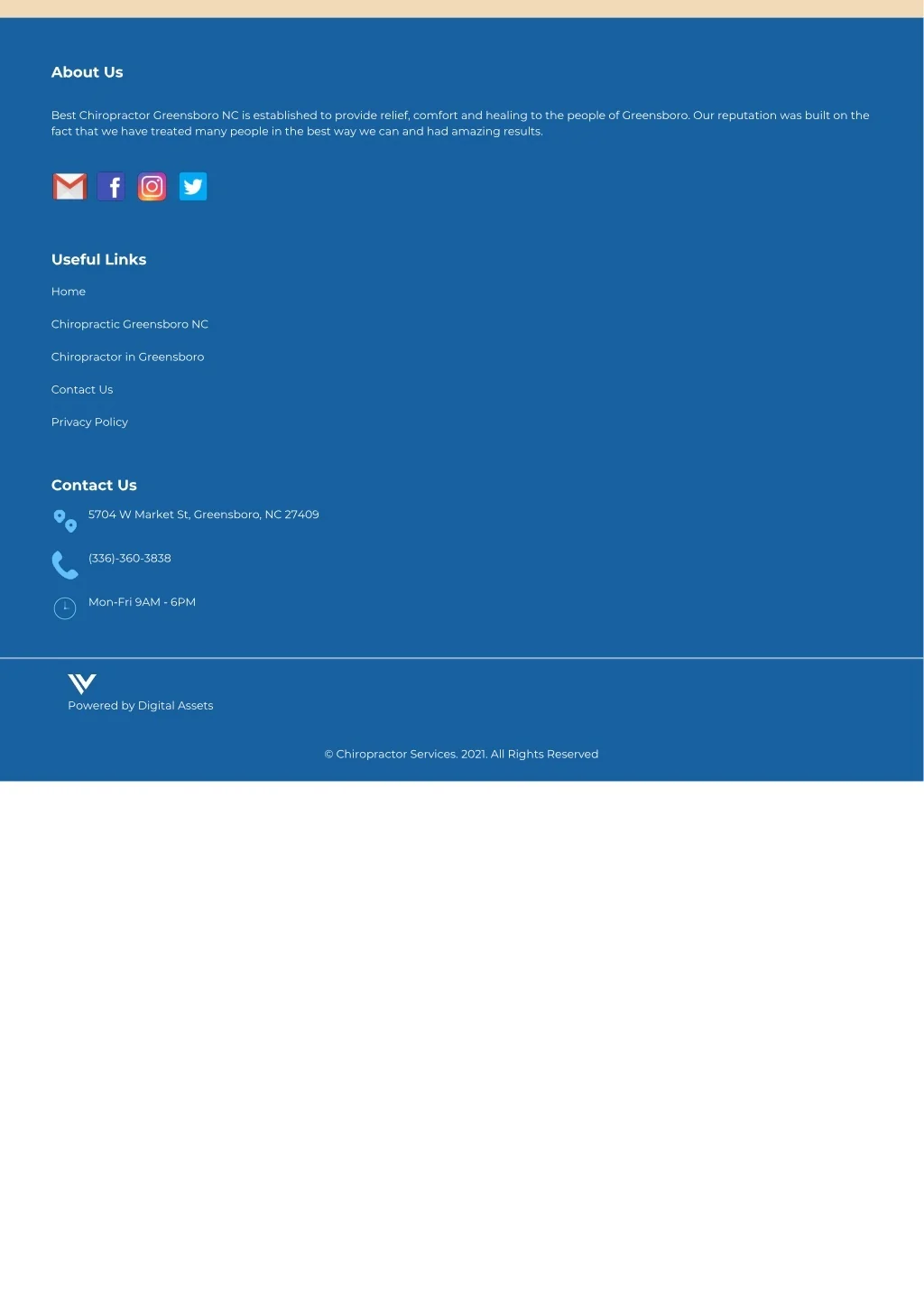 About Us Best Chiropractor Greensboro NC is established to provide relief, comfort and healing to the people of Greensboro. Our reputation was built on the fact that we have treated many people in the best way we can and had amazing results. Useful Links Home Chiropractic Greensboro NC Chiropractor in Greensboro Contact Us Privacy Policy Contact Us 5704 W Market St, Greensboro, NC 27409 (336)-360-3838 Mon‐Fri 9AM ‐ 6PM Powered by Digital Assets © Chiropractor Services. 2021. All Rights Reserved