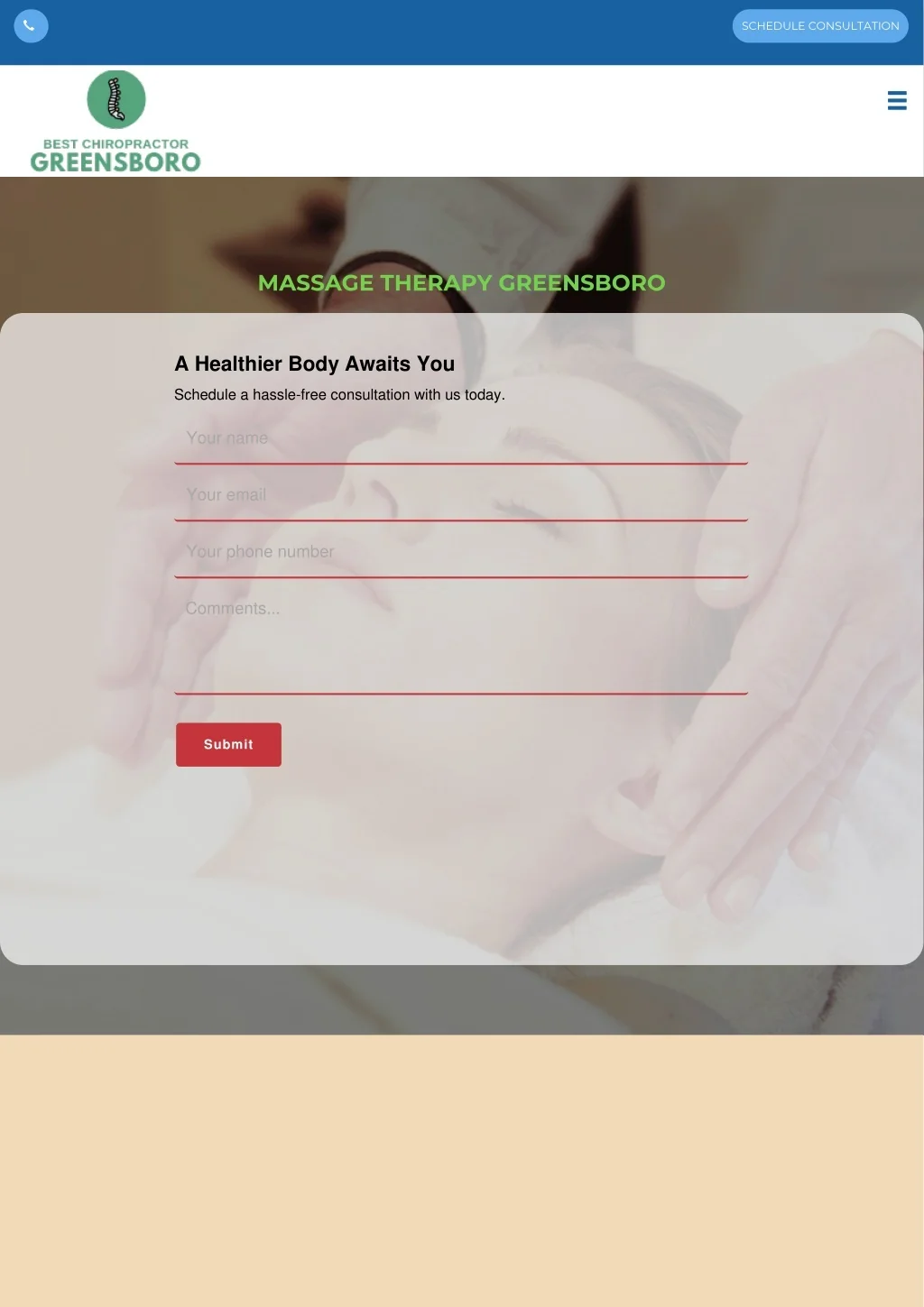 SCHEDULE CONSULTATION MASSAGE THERAPY GREENSBORO A Healthier Body Awaits You Schedule a hassle-free consultation with us today. Your name Your email Your phone number Comments... Submit
