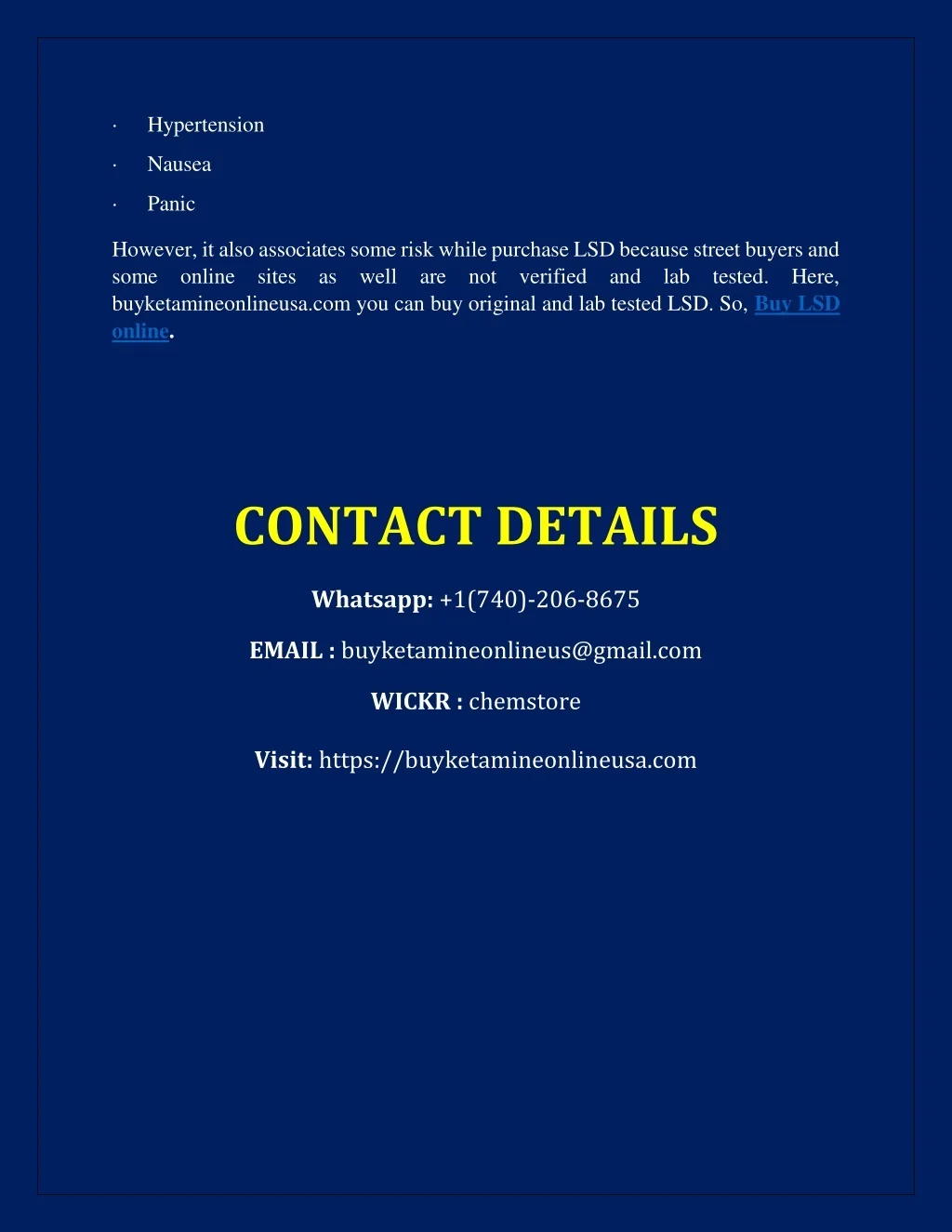 ·Hypertension ·Nausea ·Panic However, it also associates some risk while purchase LSD because street buyers and some online sites as well are not verified and lab tested. Here, buyketamineonlineusa.com you can buy original and lab tested LSD. So, Buy LSD online. CONTACT DETAILS Whatsapp: +1(740)-206-8675 EMAIL : buyketamineonlineus@gmail.com WICKR : chemstore Visit: https://buyketamineonlineusa.com