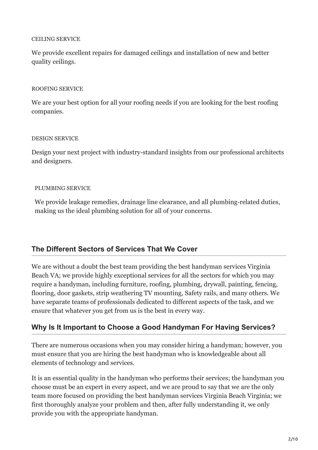 CEILING SERVICE We provide excellent repairs for damaged ceilings and installation of new and better quality ceilings. ROOFING SERVICE We are your best option for all your roofing needs if you are looking for the best roofing companies. DESIGN SERVICE Design your next project with industry-standard insights from our professional architects and designers. PLUMBING SERVICE We provide leakage remedies, drainage line clearance, and all plumbing-related duties, making us the ideal plumbing solution for all of your concerns. The Different Sectors of Services That We Cover We are without a doubt the best team providing the best handyman services Virginia Beach VA; we provide highly exceptional services for all the sectors for which you may require a handyman, including furniture, roofing, plumbing, drywall, painting, fencing, flooring, door gaskets, strip weathering TV mounting, Safety rails, and many others. We have separate teams of professionals dedicated to different aspects of the task, and we ensure that whatever you get from us is the best in every way. Why Is It Important to Choose a Good Handyman For Having Services? There are numerous occasions when you may consider hiring a handyman; however, you must ensure that you are hiring the best handyman who is knowledgeable about all elements of technology and services. It is an essential quality in the handyman who performs their services; the handyman you choose must be an expert in every aspect, and we are proud to say that we are the only team more focused on providing the best handyman services Virginia Beach Virginia; we first thoroughly analyze your problem and then, after fully understanding it, we only provide you with the appropriate handyman. 2/10