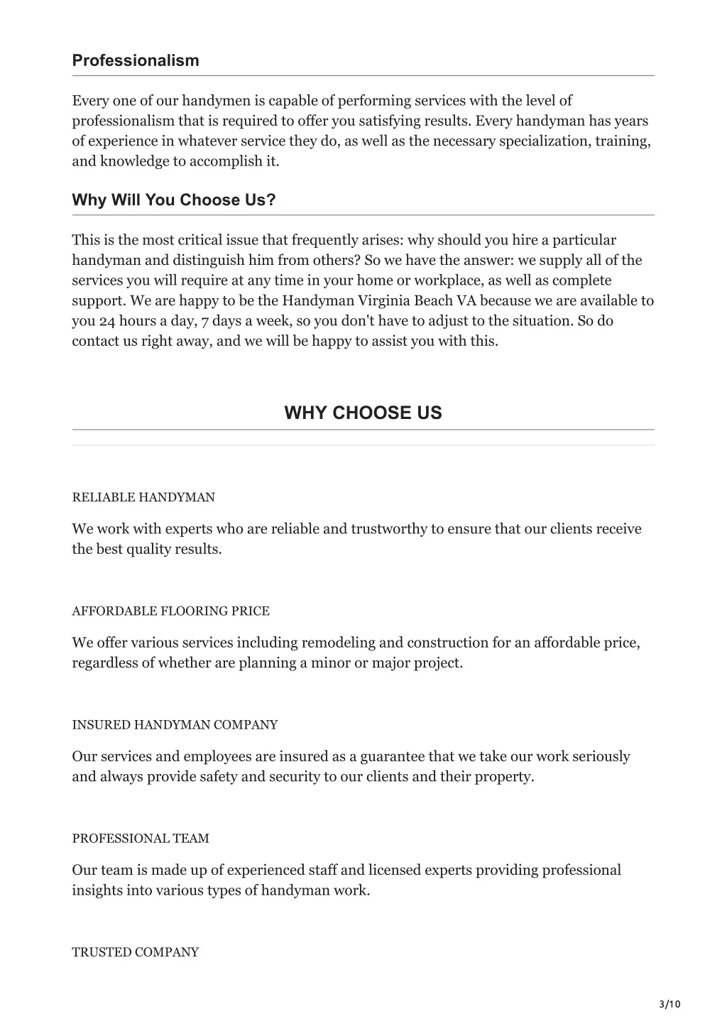 Professionalism Every one of our handymen is capable of performing services with the level of professionalism that is required to offer you satisfying results. Every handyman has years of experience in whatever service they do, as well as the necessary specialization, training, and knowledge to accomplish it. Why Will You Choose Us? This is the most critical issue that frequently arises: why should you hire a particular handyman and distinguish him from others? So we have the answer: we supply all of the services you will require at any time in your home or workplace, as well as complete support. We are happy to be the Handyman Virginia Beach VA because we are available to you 24 hours a day, 7 days a week, so you don't have to adjust to the situation. So do contact us right away, and we will be happy to assist you with this. WHY CHOOSE US RELIABLE HANDYMAN We work with experts who are reliable and trustworthy to ensure that our clients receive the best quality results. AFFORDABLE FLOORING PRICE We offer various services including remodeling and construction for an affordable price, regardless of whether are planning a minor or major project. INSURED HANDYMAN COMPANY Our services and employees are insured as a guarantee that we take our work seriously and always provide safety and security to our clients and their property. PROFESSIONAL TEAM Our team is made up of experienced staff and licensed experts providing professional insights into various types of handyman work. TRUSTED COMPANY 3/10