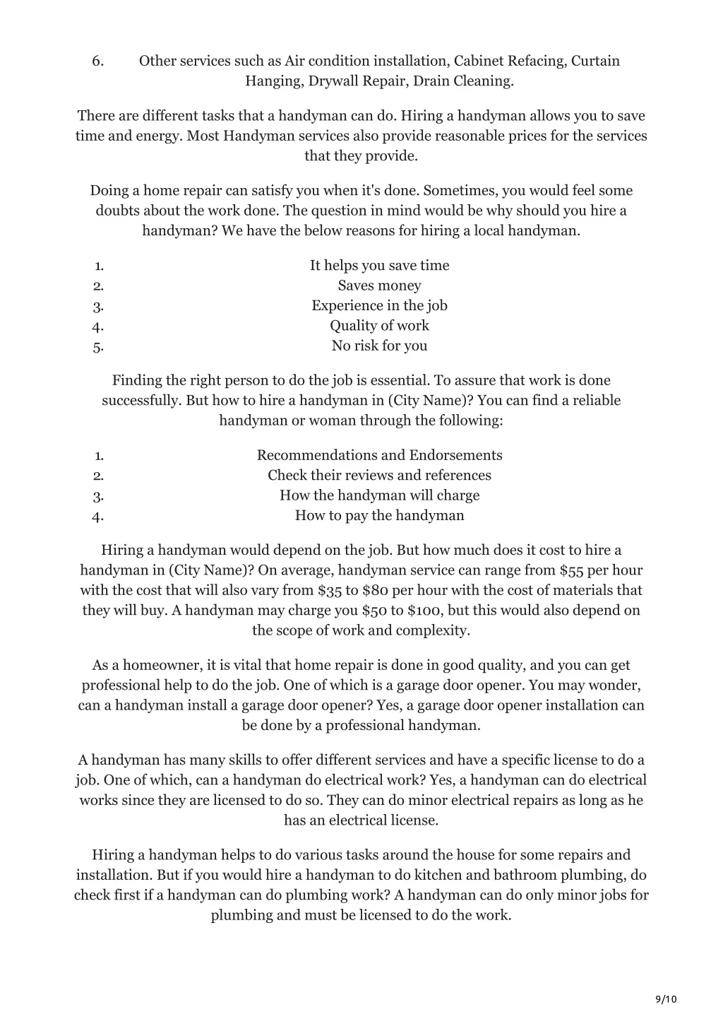 6. Other services such as Air condition installation, Cabinet Refacing, Curtain Hanging, Drywall Repair, Drain Cleaning. There are different tasks that a handyman can do. Hiring a handyman allows you to save time and energy. Most Handyman services also provide reasonable prices for the services that they provide. Doing a home repair can satisfy you when it's done. Sometimes, you would feel some doubts about the work done. The question in mind would be why should you hire a handyman? We have the below reasons for hiring a local handyman. 1. 2. 3. 4. 5. It helps you save time Saves money Experience in the job Quality of work No risk for you Finding the right person to do the job is essential. To assure that work is done successfully. But how to hire a handyman in (City Name)? You can find a reliable handyman or woman through the following: 1. 2. 3. 4. Recommendations and Endorsements Check their reviews and references How the handyman will charge How to pay the handyman Hiring a handyman would depend on the job. But how much does it cost to hire a handyman in (City Name)? On average, handyman service can range from $55 per hour with the cost that will also vary from $35 to $80 per hour with the cost of materials that they will buy. A handyman may charge you $50 to $100, but this would also depend on the scope of work and complexity. As a homeowner, it is vital that home repair is done in good quality, and you can get professional help to do the job. One of which is a garage door opener. You may wonder, can a handyman install a garage door opener? Yes, a garage door opener installation can be done by a professional handyman. A handyman has many skills to offer different services and have a specific license to do a job. One of which, can a handyman do electrical work? Yes, a handyman can do electrical works since they are licensed to do so. They can do minor electrical repairs as long as he has an electrical license. Hiring a handyman helps to do various tasks around the house for some repairs and installation. But if you would hire a handyman to do kitchen and bathroom plumbing, do check first if a handyman can do plumbing work? A handyman can do only minor jobs for plumbing and must be licensed to do the work. 9/10