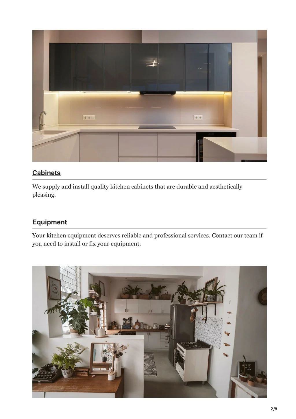 Cabinets We supply and install quality kitchen cabinets that are durable and aesthetically pleasing. Equipment Your kitchen equipment deserves reliable and professional services. Contact our team if you need to install or fix your equipment. 2/8