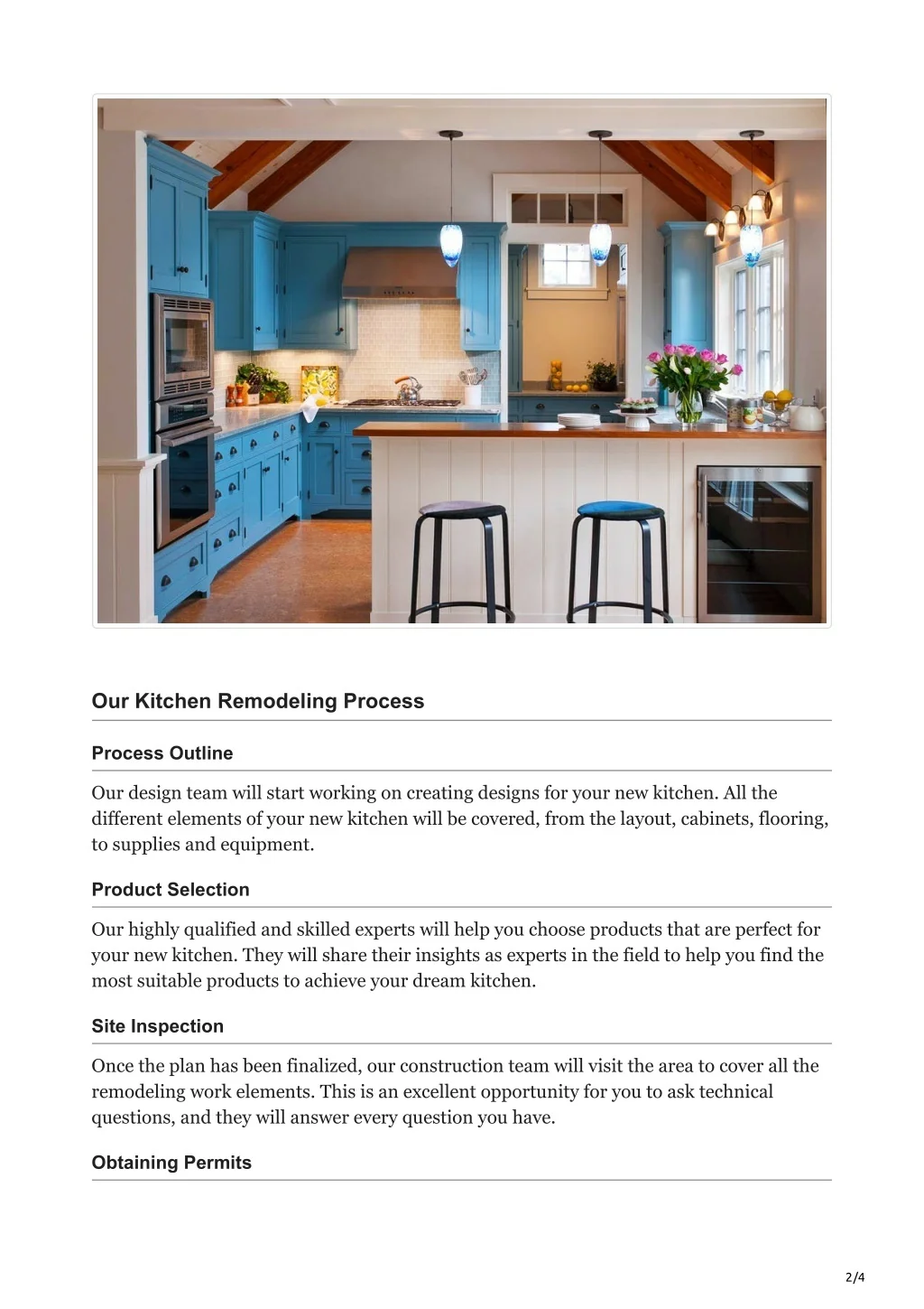 Our Kitchen Remodeling Process Process Outline Our design team will start working on creating designs for your new kitchen. All the different elements of your new kitchen will be covered, from the layout, cabinets, flooring, to supplies and equipment. Product Selection Our highly qualified and skilled experts will help you choose products that are perfect for your new kitchen. They will share their insights as experts in the field to help you find the most suitable products to achieve your dream kitchen. Site Inspection Once the plan has been finalized, our construction team will visit the area to cover all the remodeling work elements. This is an excellent opportunity for you to ask technical questions, and they will answer every question you have. Obtaining Permits 2/4