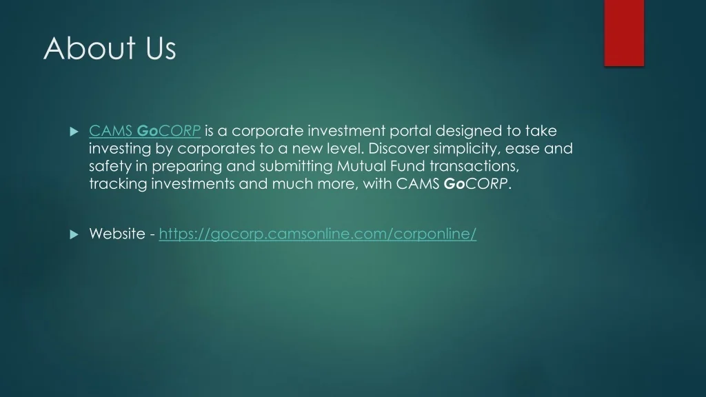About Us • CAMS GoCORP is a corporate investment portal designed to take investing by corporates to a new level. Discover simplicity, ease and safety in preparing and submitting Mutual Fund transactions, tracking investments and much more, with CAMS GoCORP. • Website - https://gocorp.camsonline.com/corponline/